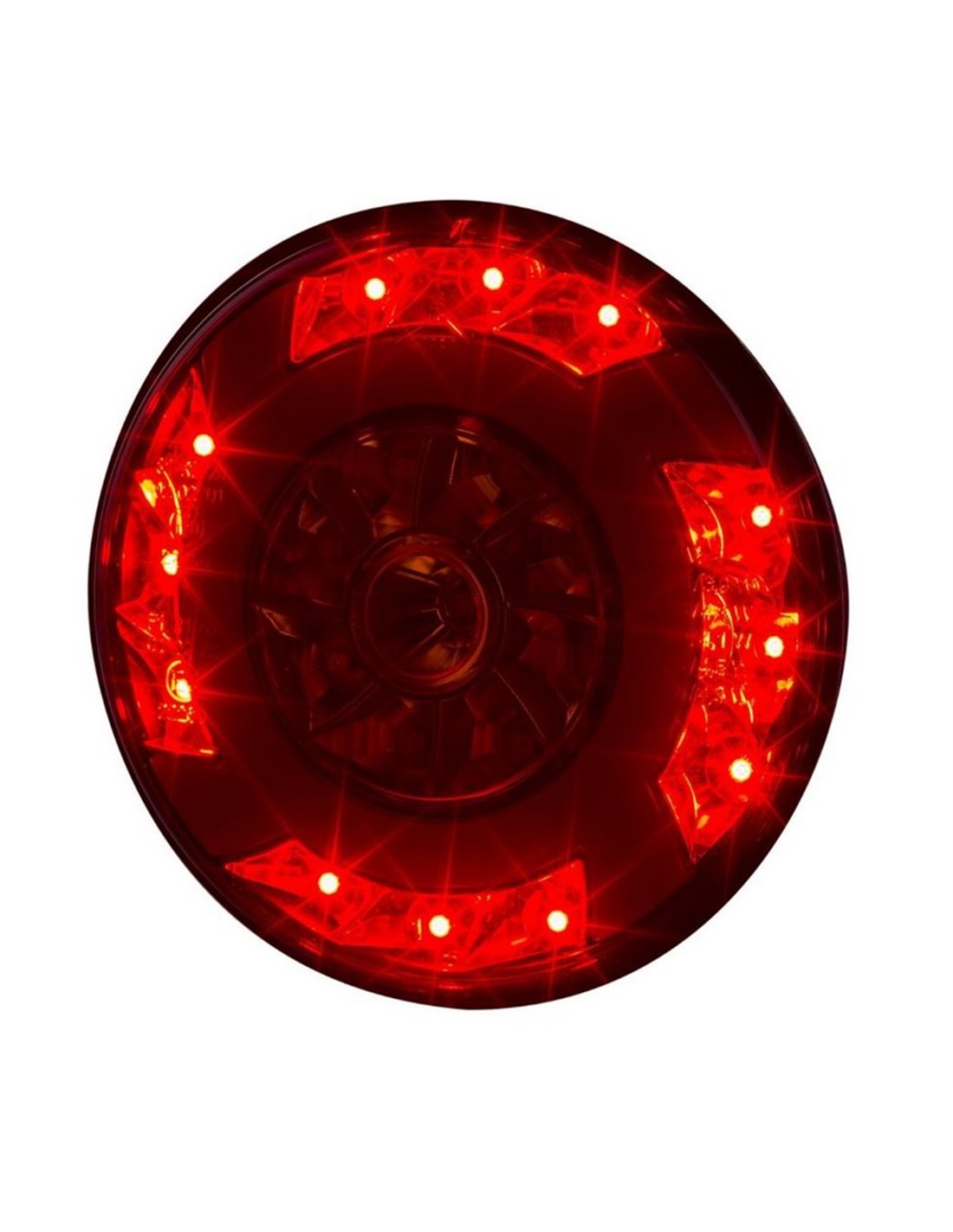 Funktioniert mit universeller Spannung 12/24 V in Gleichstrom und kombiniert drei wesentliche Funktionen: Positionslicht, Bremslicht und Blinker. Das optische Set enthält 9 weiße LED und 32 rote LED, die eine klare und gleichmäßige Signalgebung gewährleisten.
