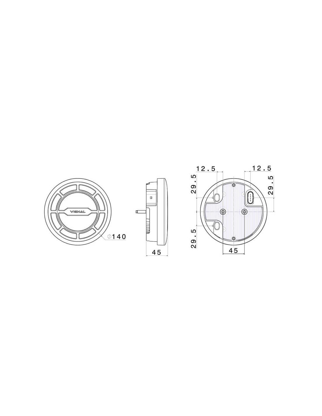 Entwickelt mit einem IP69K dichten Gehäuse, ist es vollständig wasserdicht, schmutz- und staubbeständig sowie hochdruckreinigungsfest, perfekt für extreme Bedingungen. Es ist ein kompaktes und leichtes Rücklicht mit runder Form (Ø 140 mm), kompatibel mit seitlicher Montage links oder rechts in horizontaler Position.