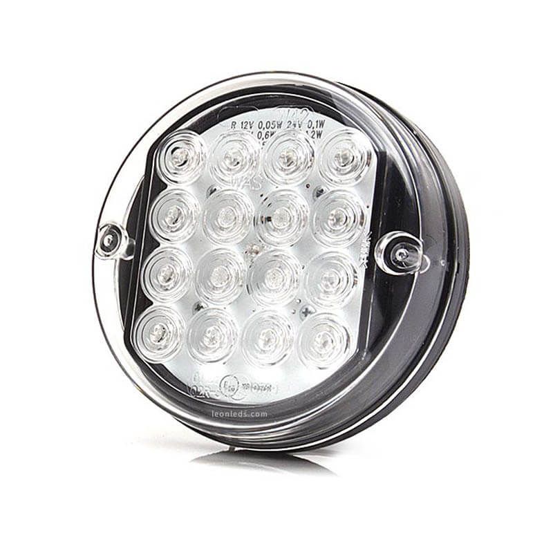 Kleiner runder LED-Pilot mit 3 Funktionen zur Installation an der Rückseite von Fahrzeugen mit 12V und 24V, Durchmesser von 11,5 cm und einer Dicke von nur 3,85 cm, enthält 0,75 cm Kabel für die Installation. Homologiert und völlig tauchfähig und wasserdicht.