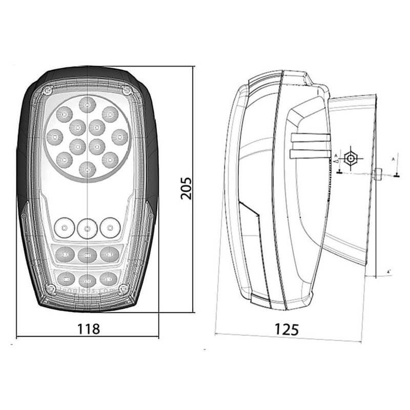 LED-Scheinwerfer mit den Funktionen von Position, Blinker und Abblendlicht, geeignet für 12V und 24V. Dieses Modell ist vollständig wasserdicht IP69K, vibrationsfest 5Grms (von 24Hz bis 2000Hz). Er kann sowohl vertikal als auch horizontal installiert werden und die Maße siehst du auf einem der Fotos. Für die Verbindung benötigst du einen 4-poligen Deutsch-Stecker (nicht enthalten). Offroad-Modell.