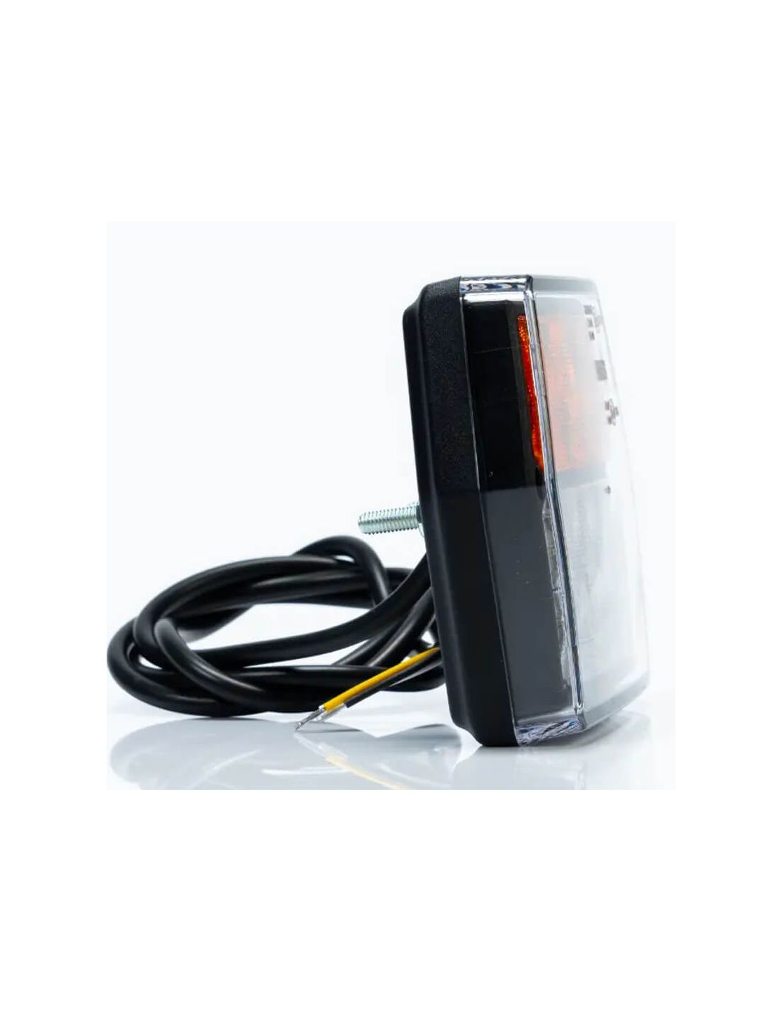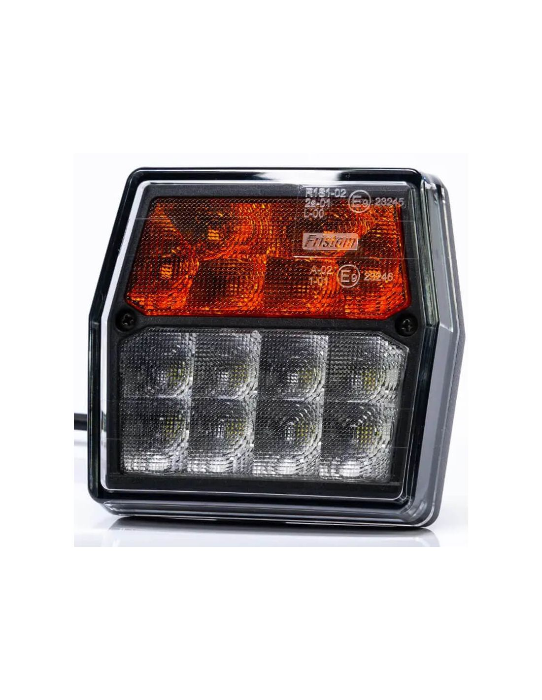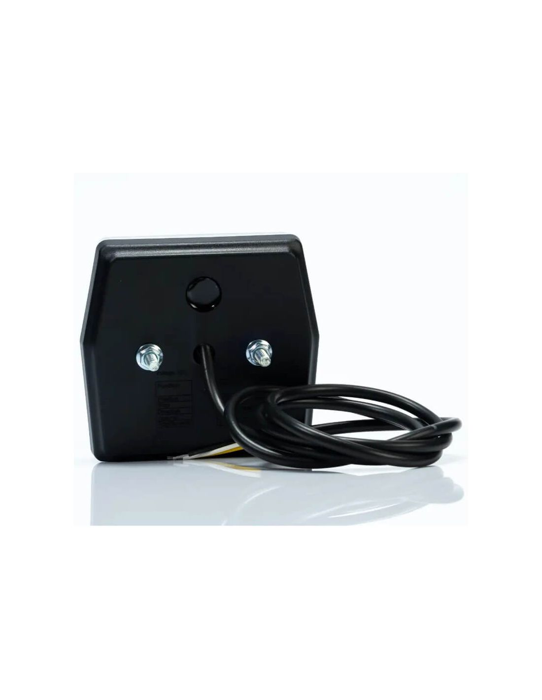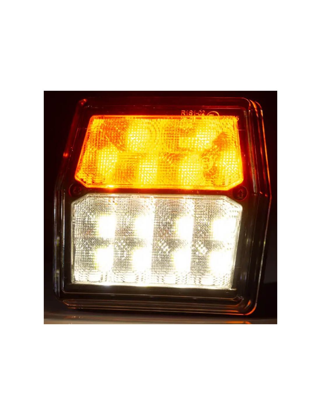 Genehmigter quadratischer LED-Scheinwerfer mit 2 Funktionen, Blinker und Frontlicht, erhältlich mit 1 Meter Kabel oder 5-poligem Bajonettstecker. Die Abmessungen sind in einem der Bilder zu sehen und funktionieren mit einer Spannung von 12V bis 15V.