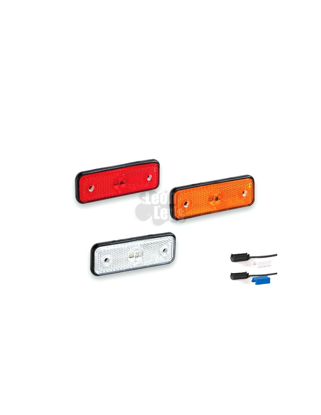 Positions- oder Seiten-LED-Leuchten rechteckig mit abgerundeten Ecken, mit transparentem Lampenschirm und mit Gummi auf der Rückseite für eine bessere Anpassung im Falle einer Montage ohne Halterung. Sie sind in 3 Farben erhältlich: Amber für die Seite, Rot für die Rückseite oder Weiß für die Vorderseite. Die Chips erzeugen das Licht in der gewählten Farbe.