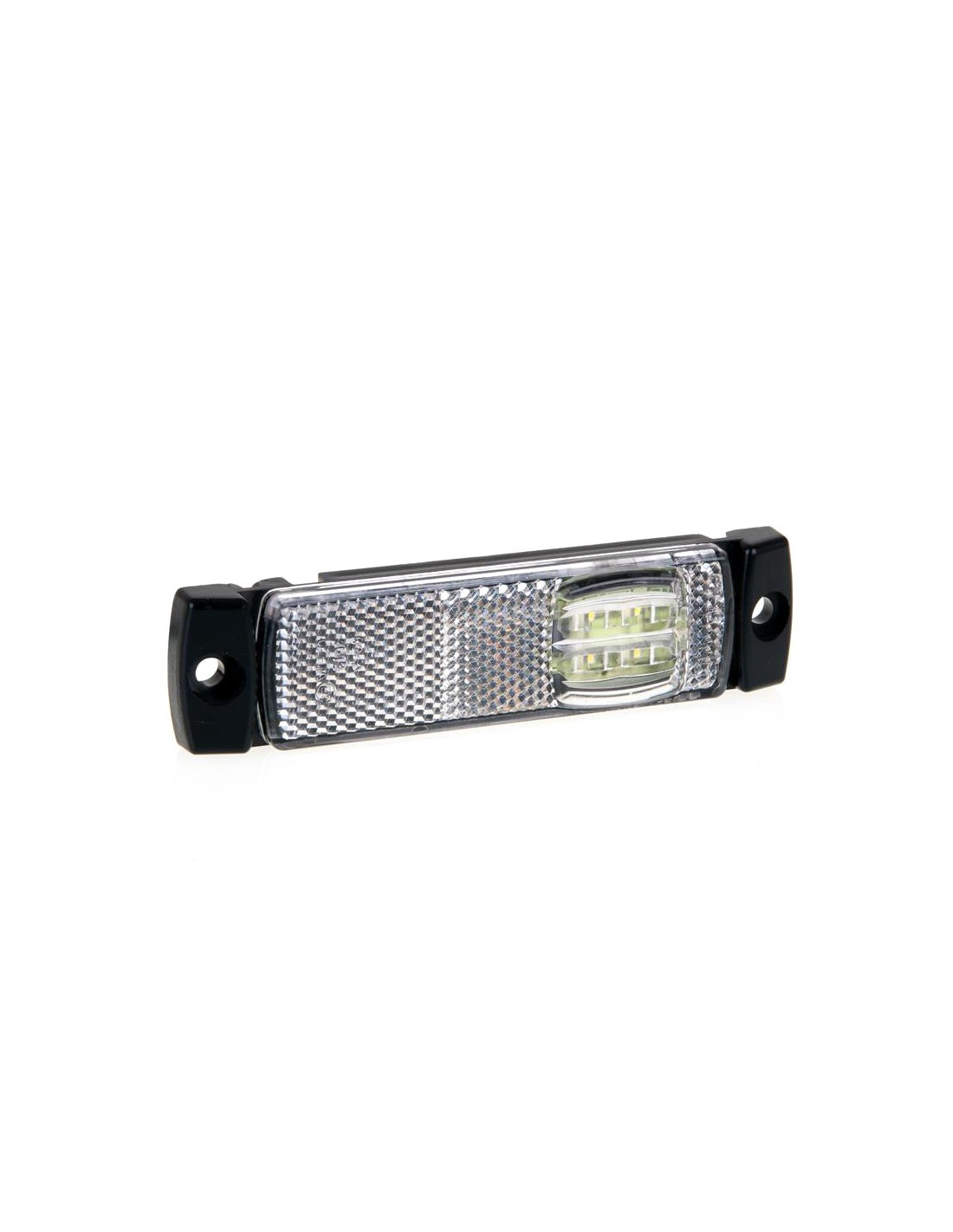 Diese LED-Leuchte ist rechteckig mit 2 Enden in schwarzer Farbe, an denen sich die zwei Schrauböffnungen befinden. Die 4 Chips sind auf einer Seite der Glasabdeckung angeordnet, wodurch der restliche Teil der Abdeckung als katadioptrisch bleibt, und sie sind erhältlich in Weiß für die Vorderseite, Rot für die Rückseite oder Amber für die Seite. Diese LED-Leuchten sind ohne Halterung und mit einem halben Meter Kabel für den elektrischen Anschluss erhältlich.