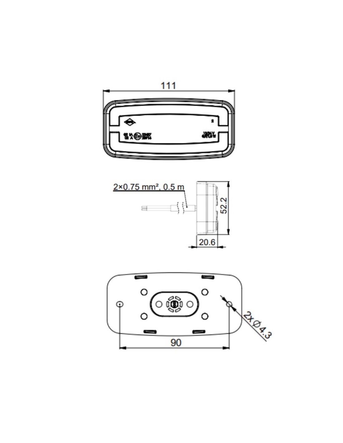 Abmessungen: 111×52,2 mm | Tiefe 20,6 mm | Befestigung 2ר4,3 mm (90 mm zwischen den Zentren) | Kabel 0,5 m 2×0,75 mm².