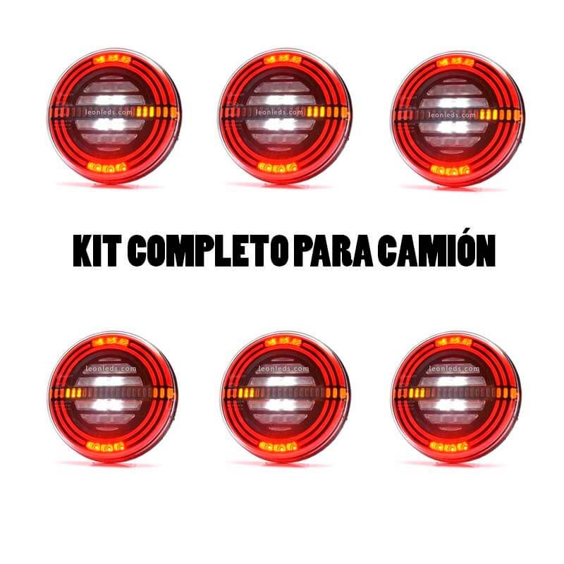 Set von 6 runden LED-Rücklichtern, geeignet für 12 Volt und 24 Volt, die 4 runden LED-Rücklichter verfügen über 5 Funktionen: Position, progressives Blinklicht, intelligentes Bremslicht, Nebelscheinwerfer und Rückfahrlicht.