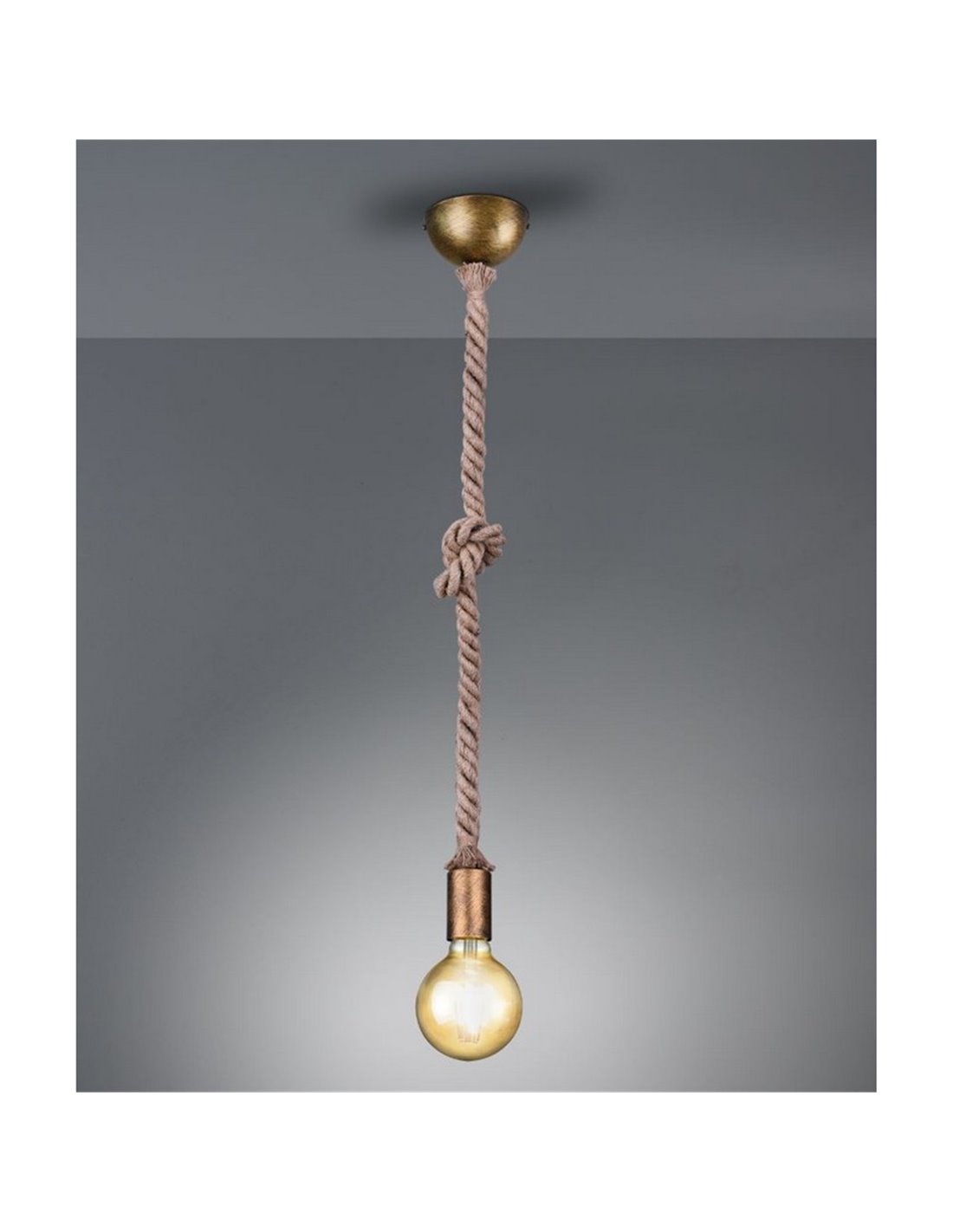 Vintage Seil-Deckenlampe mit einer runden Deckenbasis in gealtertem Kupfer und einem Durchmesser von 10 cm. Die Lampe hat eine Gesamthöhe von 150 cm, die durch Knoten wie auf dem Foto bis zur gewünschten Größe verkürzt werden kann. Diese Deckenlampe benötigt eine E27-LED-Lampe im globusförmigen G120 mit goldenem Farbton.