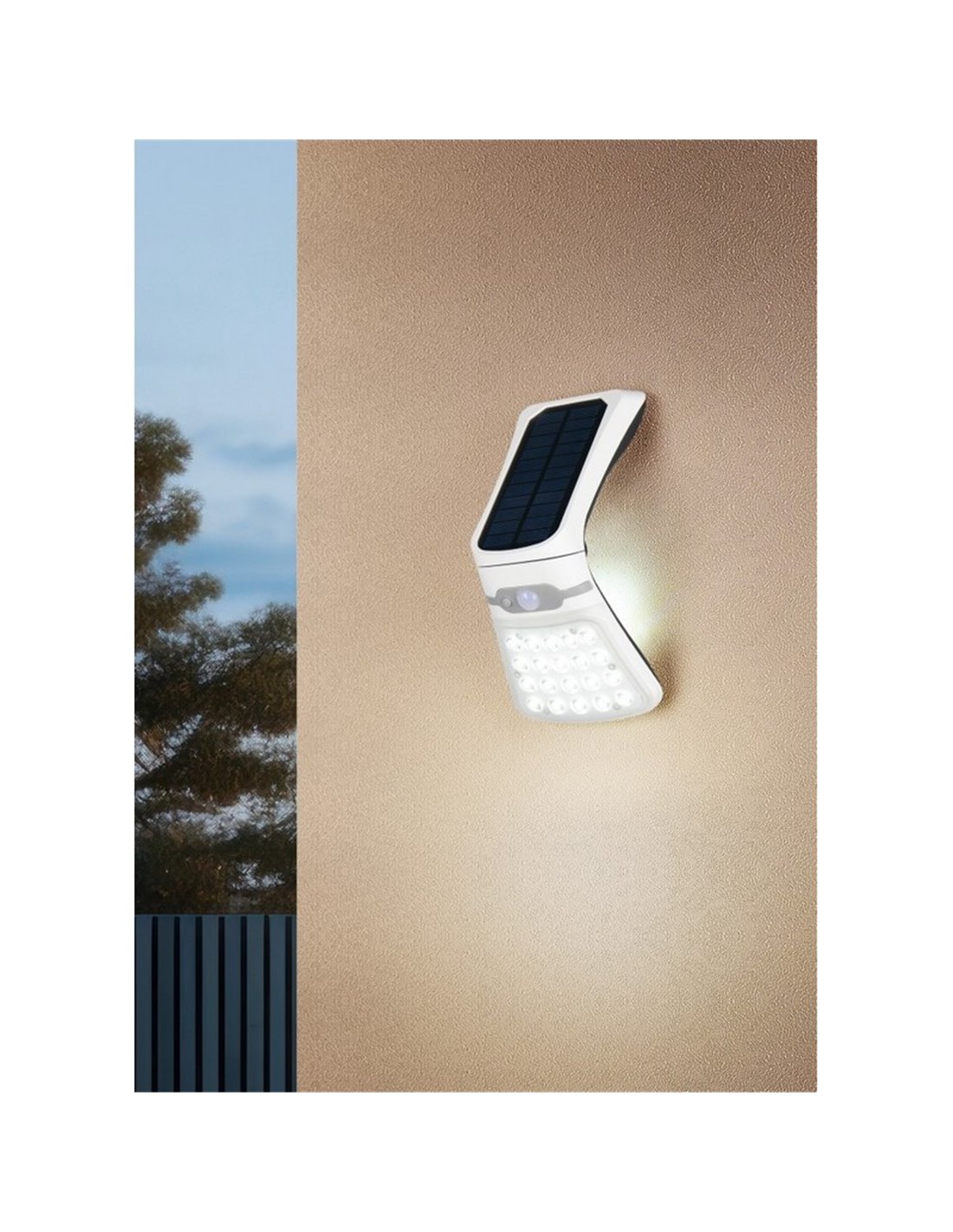 Die Solar LED Wandlampe DIADEMA ist ideal für Außenbereich. Mit einer Leistung von 3,5 W und einem Lichtstrom von 300 lm bei 4000 K (neutralweiß) bietet sie ein schwenkbares Design und einen integrierten Bewegungssensor, sowie einen praktischen Schalter für eine einfache Steuerung. Ihr IP44-Schutz sichert die Widerstandsfähigkeit gegenüber Witterungsbedingungen.