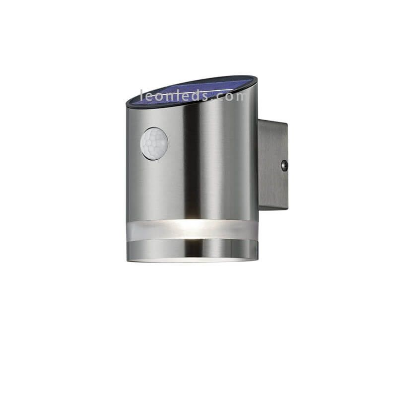 Solar-LED-Wandleuchte Salta mit Bewegungssensor zur Installation im Freien mit einer Leistung von 3W, einer Lichtstärke von 165Lm und einem warmen Lichtton von 3000K. Sie ist aus Edelstahl gefertigt und hat einen Schutzgrad gegen Wasser und Staub von IP44, was sie perfekt für die Montage im Außenbereich macht und nur bei Bewegung aktiviert wird.