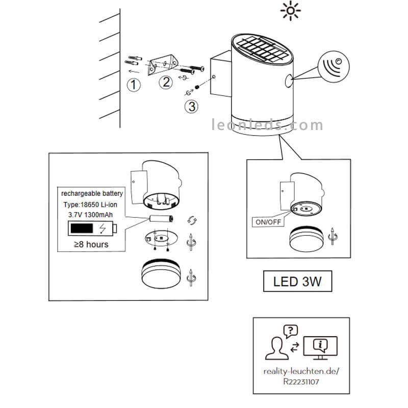 Diese Solar-LED Wandleuchte Salta verfügt über einen Li-Ion 18650 Akku mit 3,7V und 1300mAh, der durch Sonnenstrahlung aufgeladen wird. Sie enthält einen Schalter, um sie im Winter oder wenn wir nicht möchten, dass sie funktioniert, auszuschalten und so die Batterie zu schonen; die maximale Autonomie bei vollständiger Aufladung beträgt bis zu 8 Stunden.