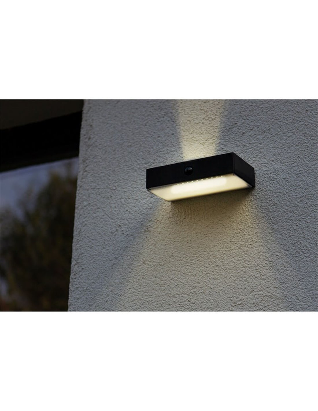 Die Solarwandlampe Fadi hat einen Sensor, der sich automatisch bei Dunkelheit einschaltet und ihren Energieverbrauch mit ihrem Solar-Ladesystem effizient nutzt.