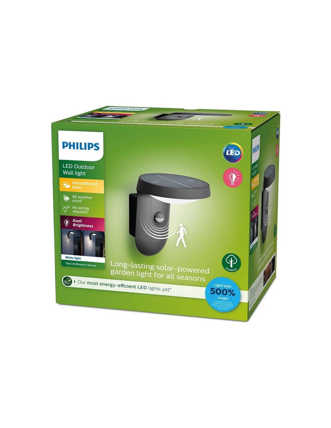 Die Solarlampe LED TYLA von Philips bietet ein warmes Licht von 2700K mit Bewegungssensor, perfekt für den Außenbereich. Wasserdicht mit IP44-Klassifizierung, keine Verkabelung erforderlich und hat eine Lebensdauer von bis zu 50.000 Stunden. Effizient und langlebig, ideal zur Beleuchtung Ihres Gartens.