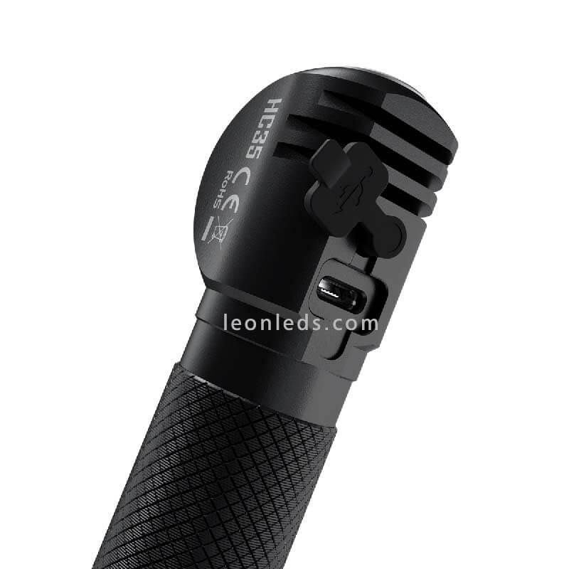 Zum Laden des Akkus müssen wir ihn nicht aus der Nitecore HC35 Lampe entfernen, er wird über das mitgelieferte USB-Kabel geladen, indem eine Schutzgummischutzkappe entfernt wird.