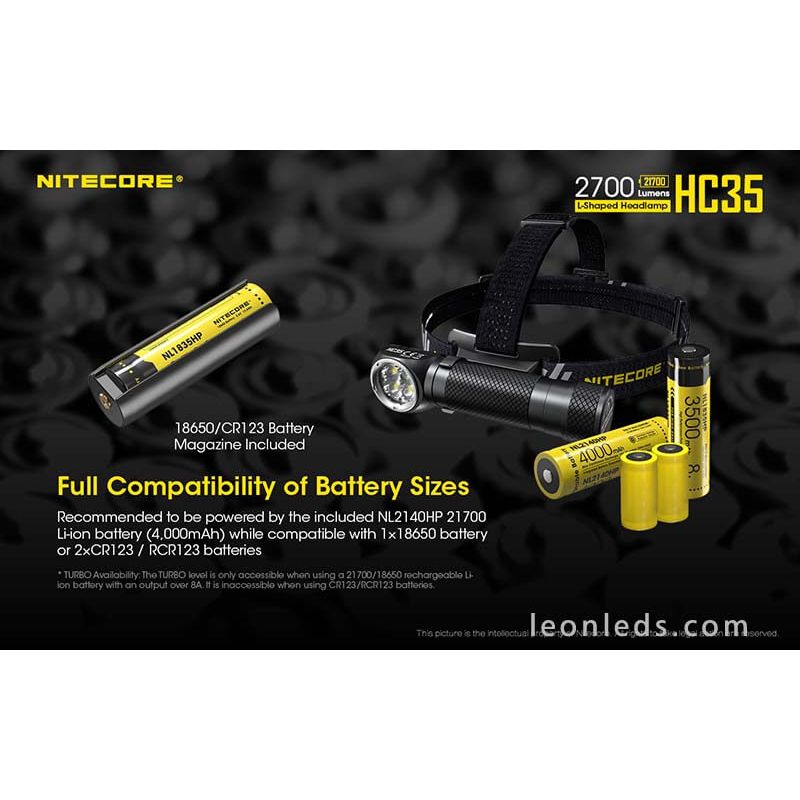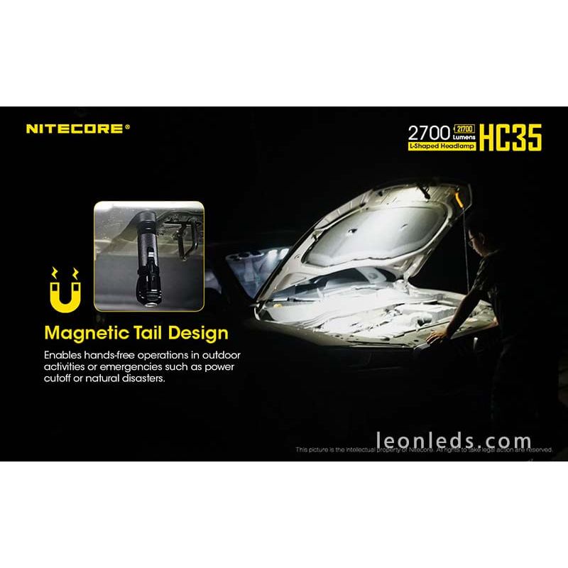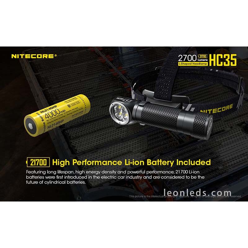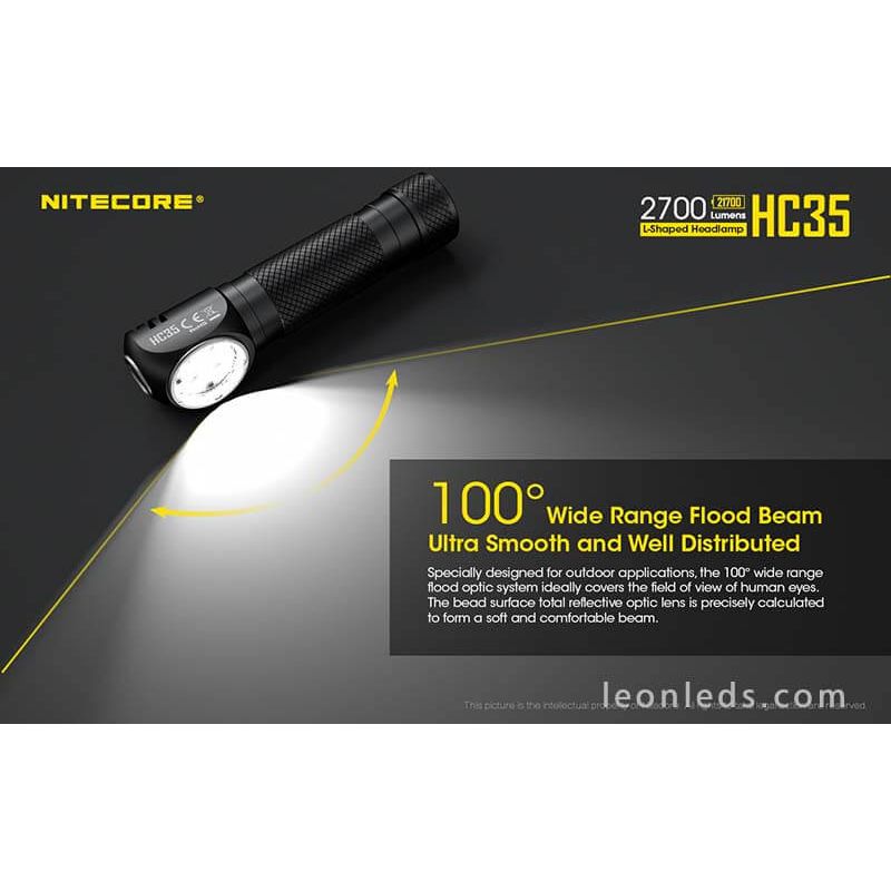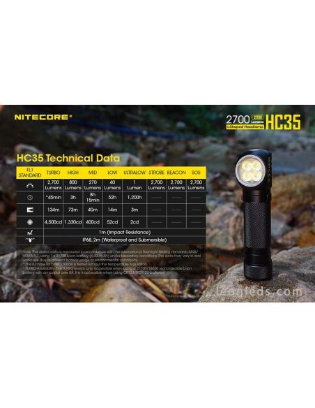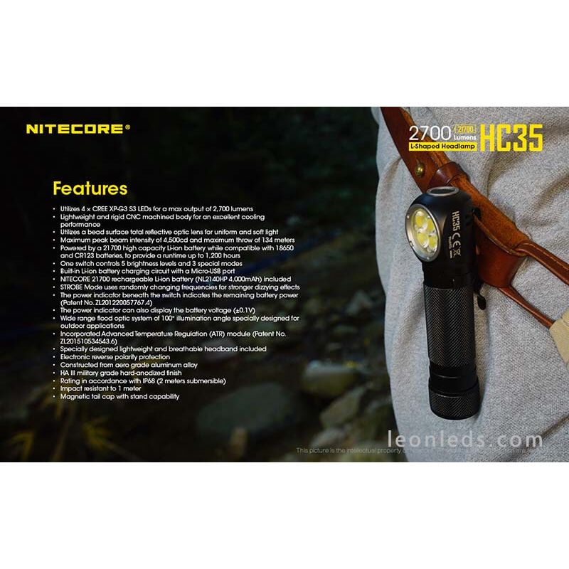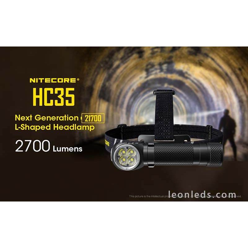 Leistungsstarke LED-Stirnlampe Nitecore HC35 mit einer maximalen Leistung von 2.700 Lumen oder 4.500Cd (4 CREE XP-G3 S3 Chips), 5 Leistungsstufen und 3 Spezialmodi (SOS, Strobe und Beacon), enthält 1 21700 Akku mit 4000mAh und einer maximalen Laufzeit von bis zu 1.200 Stunden, bei maximaler Leistung von 2700Lm 45 Minuten, eine maximale Reichweite von 134 Metern, Schlagfestigkeit bis zu 1 Meter, IP68 Wasserdichtigkeit, die ein Eintauchen in Wasser bis zu 2 Metern Tiefe erlaubt, ist magnetisch an der Unterseite und bietet einen Abstrahlwinkel von 100°.
