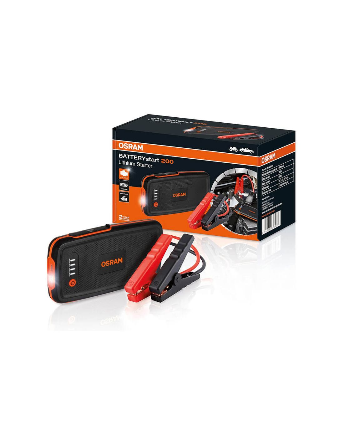 Das OSRAM BATTERYstart 200 ist ein kompaktes und leistungsstarkes Starthilfegerät mit einer Lithium-Batterie von 6000mAh, entworfen für Fahrzeuge bis zu 3L. Es enthält Schutz gegen Überspannungen, Verpolung und Kurzschlüsse. Außerdem bietet es eine USB-Powerbank-Funktion zum Laden von Geräten.