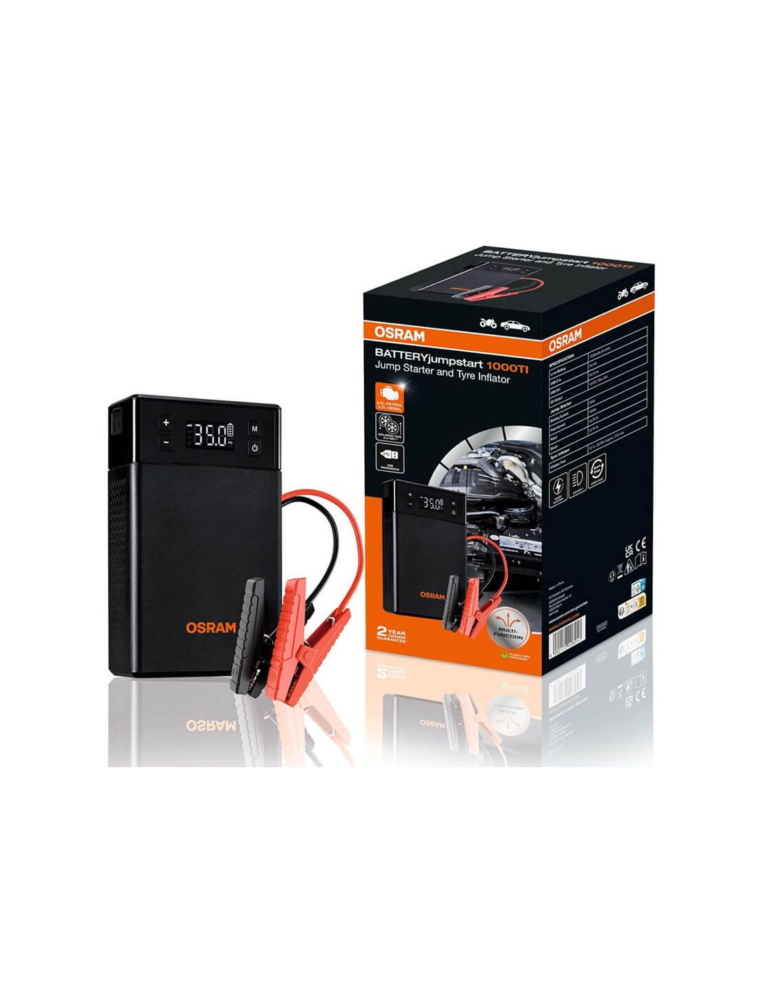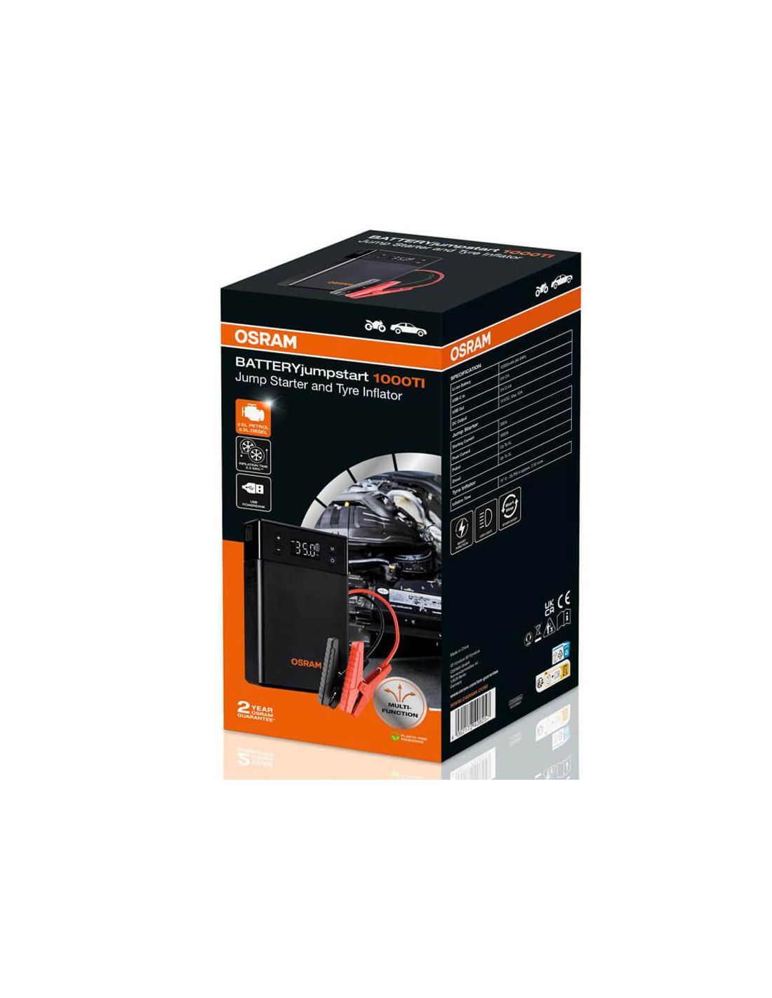 Der OSRAM BATTERYjumpstart 1000TI ist ein multifunktionales Starthilfegerät mit Reifenkompressor und USB-Powerbank, geeignet für Benzinmotoren bis 5L und Dieselmotoren bis 3L. Er umfasst die Boost-Funktion, ein digitales Display und ein SOS-Notlicht.