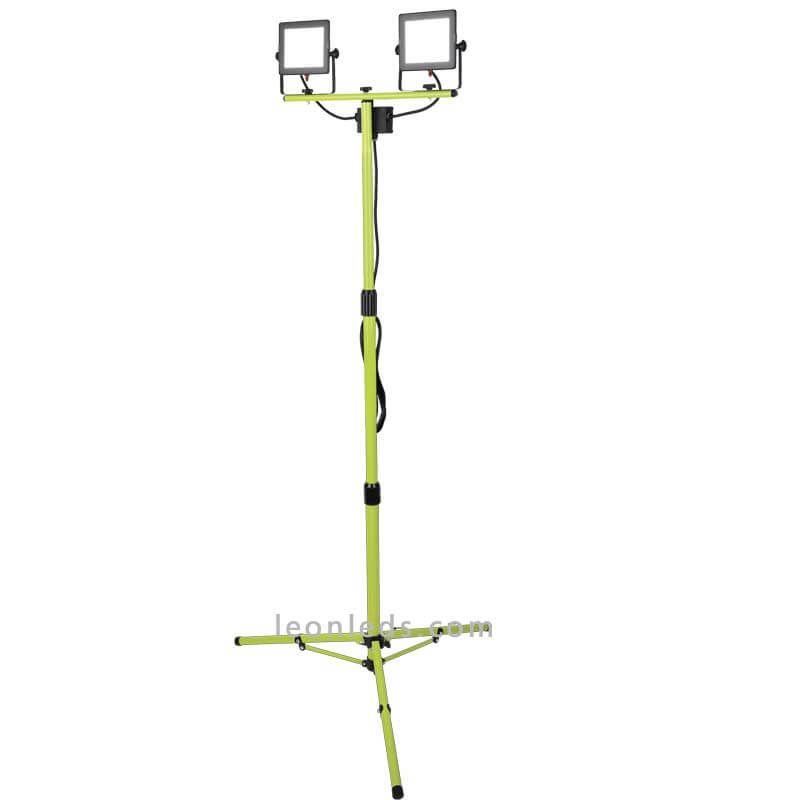 Stativ mit zwei LED-Strahlern mit einer Leistung von 50W jeweils und einer Lichtstärke von 4.000Lm pro LED-Strahler mit einer weißen Lichtfarbe von 5000K, das Stativ ist höhenverstellbar, enthält ein Kabel mit Stecker und ist sehr leicht, zudem kann jeder Strahler unabhängig ausgerichtet werden und sein Schutz gegen Wasser und Staub beträgt IP65. Jeder der LED-Strahler hat einen Schalter, um sie unabhängig ein- und auszuschalten.
