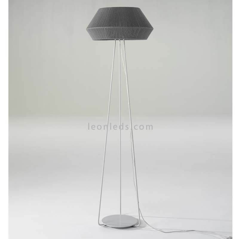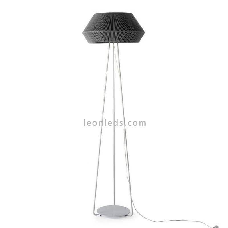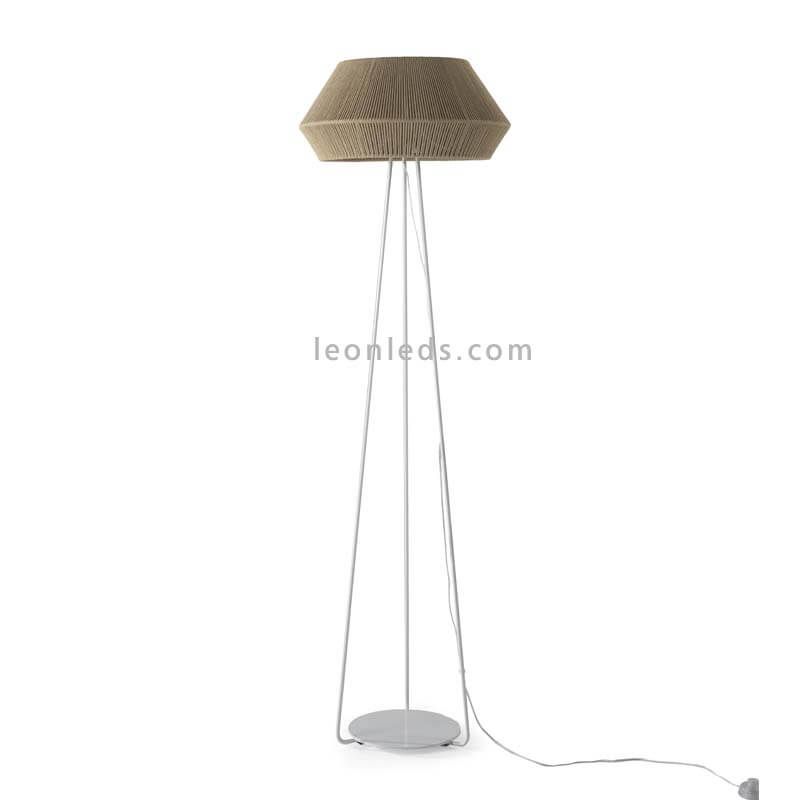 Ihr Lichtstrahl wird hinter dem individuell gestaltbaren Knotenschirm mit modernem Stil ausgestrahlt. Es ist eine Stehlampe für Innenräume mit Schutz gegen Wasser und Staub nach IP20. Ihr Fuß besteht aus weißem Metall und hat drei Beine in Form eines Stativs. Außerdem verfügt sie über einen Schalter zur Betätigung im weißen Kabel.