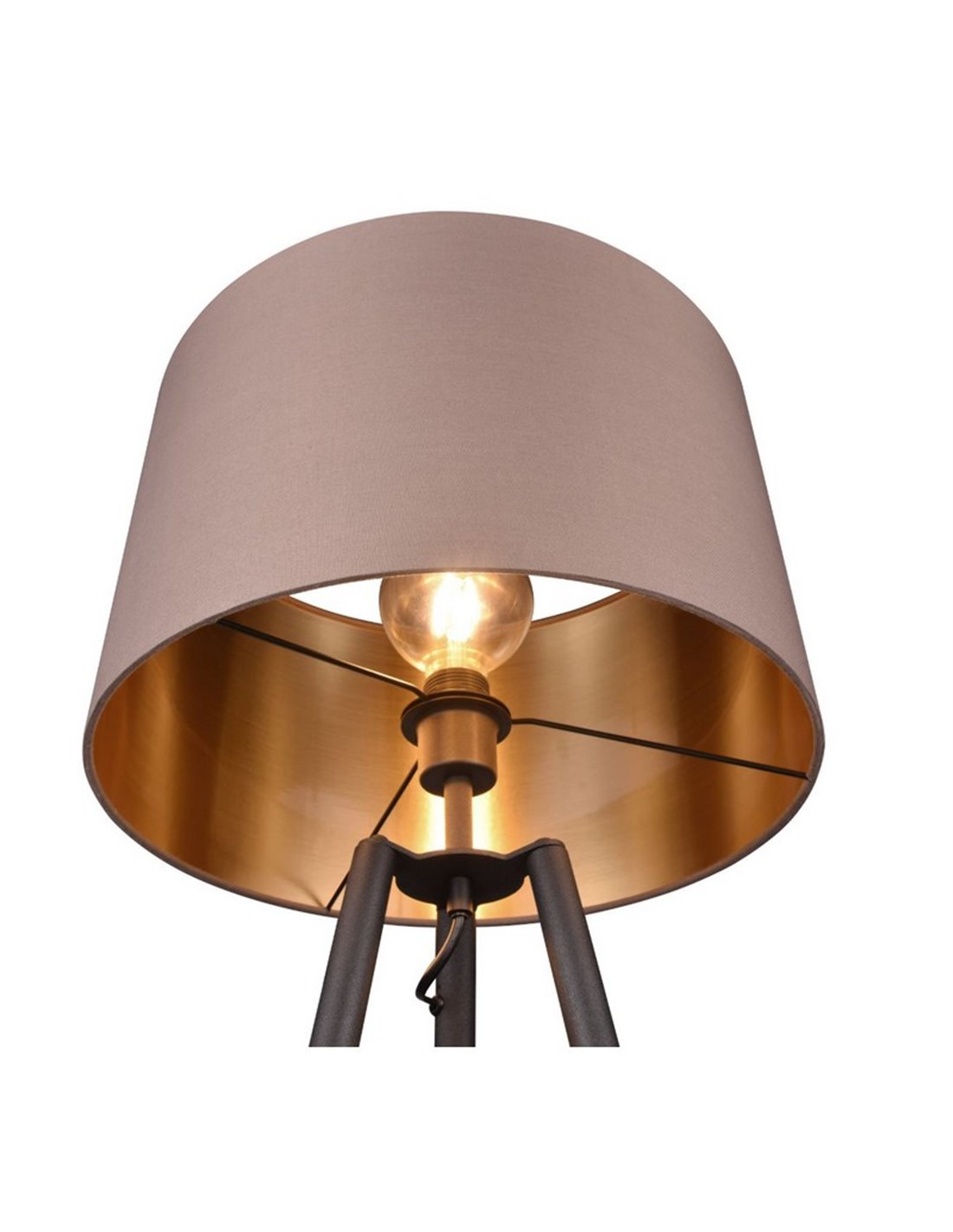 Die Stehlampe COLETTE verleiht dem Zuhause mit ihrem mattschwarzen Metallrahmen und dem textilen taupe grauen Schirm mit goldenem Innenleben einen Hauch von Eleganz und Komfort. Ihr Dreibein-Design mit integrierter Ablage ist sowohl funktional als auch dekorativ. Perfekt für Wohnzimmer, Schlafzimmer oder Flure. Sie umfasst einen Fußschalter und hat die Schutzart IP20.