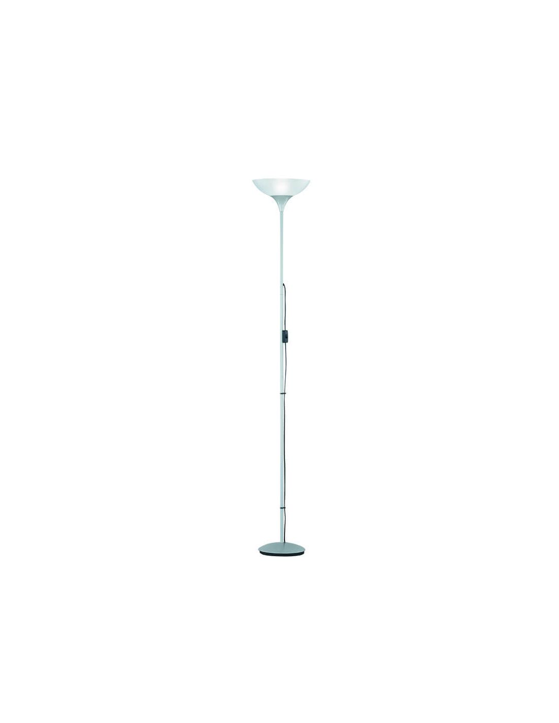 Stehlampe Dezwo 1xE27 von Trio Lighting hat einen Metallkörper in Silber mit einem kleinen Schalter, der das Einschalten der Lampe erleichtert. Diese Lampe hat einen Kopf in transparentem Weiß, sodass das Licht perfekt hindurchströmen kann.