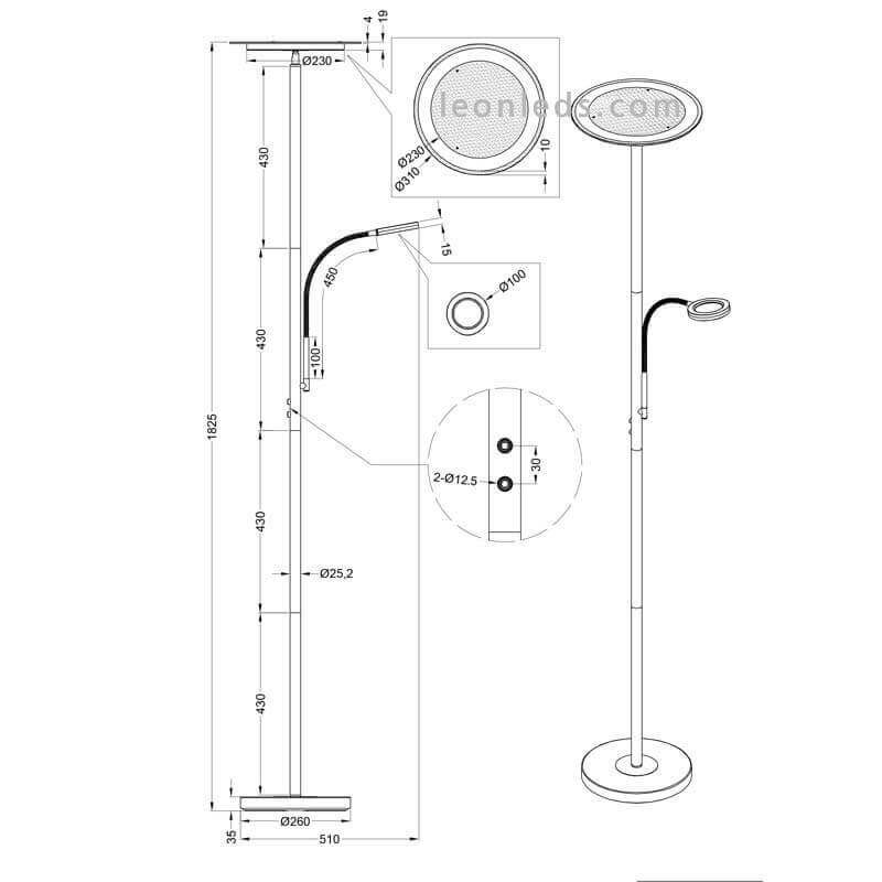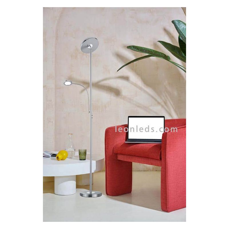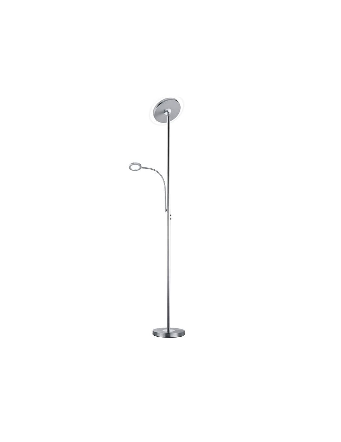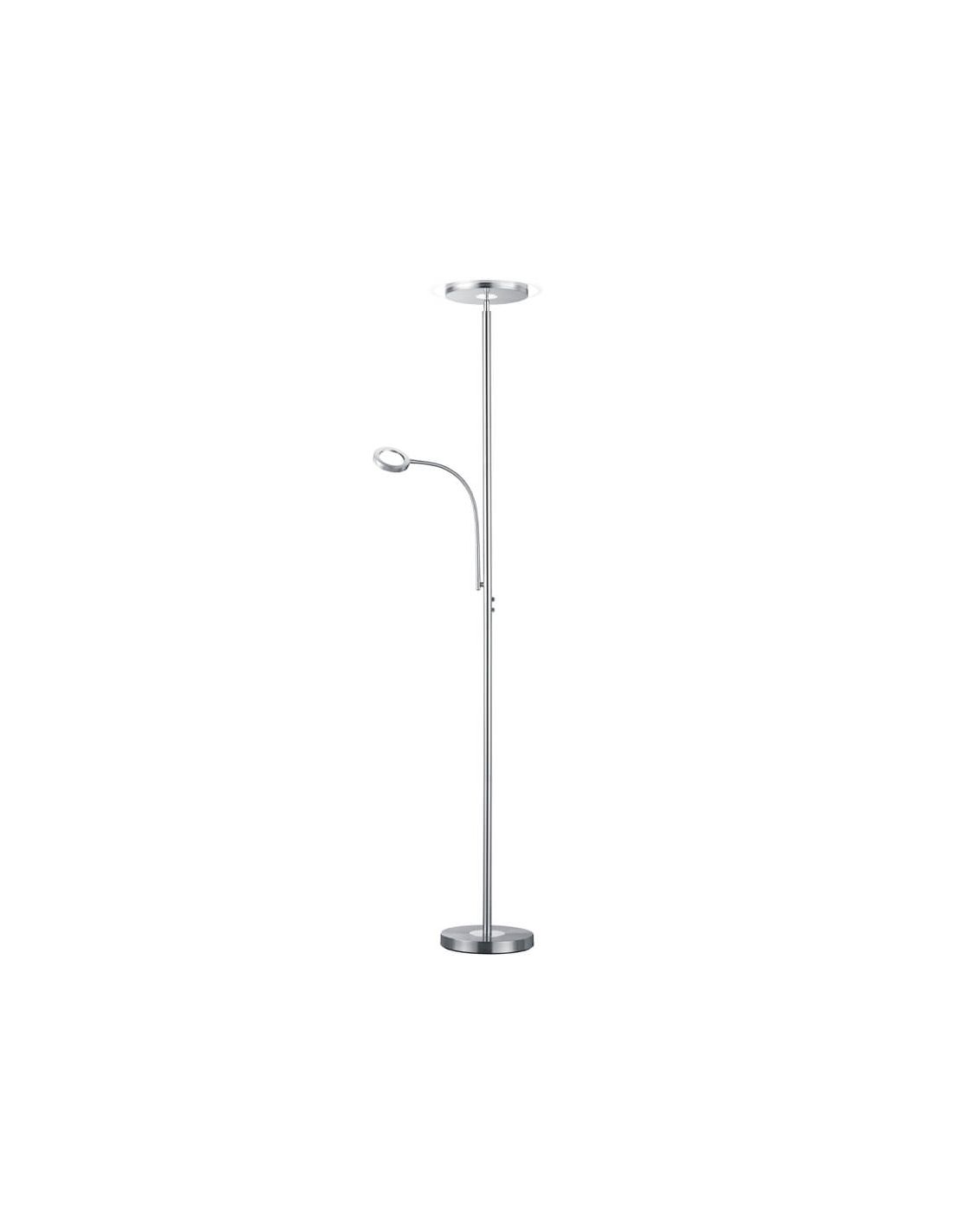 LED-Stehlampe mit flexiblem Lesearm in mattem Nickel, bietet eine einstellbare Lichtintensität nur im oberen Licht, während die Lichtintensität des Lesearms nicht einstellbar ist. Im oberen Teil haben wir eine Leistung von 18W und eine Lichtintensität von 1700Lm, während der Lesearm eine Leistung von 4W und eine Lichtintensität von 350Lm hat, beide bieten einen warmen Lichtton von 3000K. Der Lesearm ist flexibel und lässt sich leicht drehen, der obere Teil der Lampe kann um ihre Achse gedreht werden, um entweder nach oben oder zur Seite zu beleuchten, wie in den Fotos zu sehen ist. Die Intensitätsregulierung erfolgt über eine integrierte Fernbedienung in der LED-Stehlampe Ackbar.