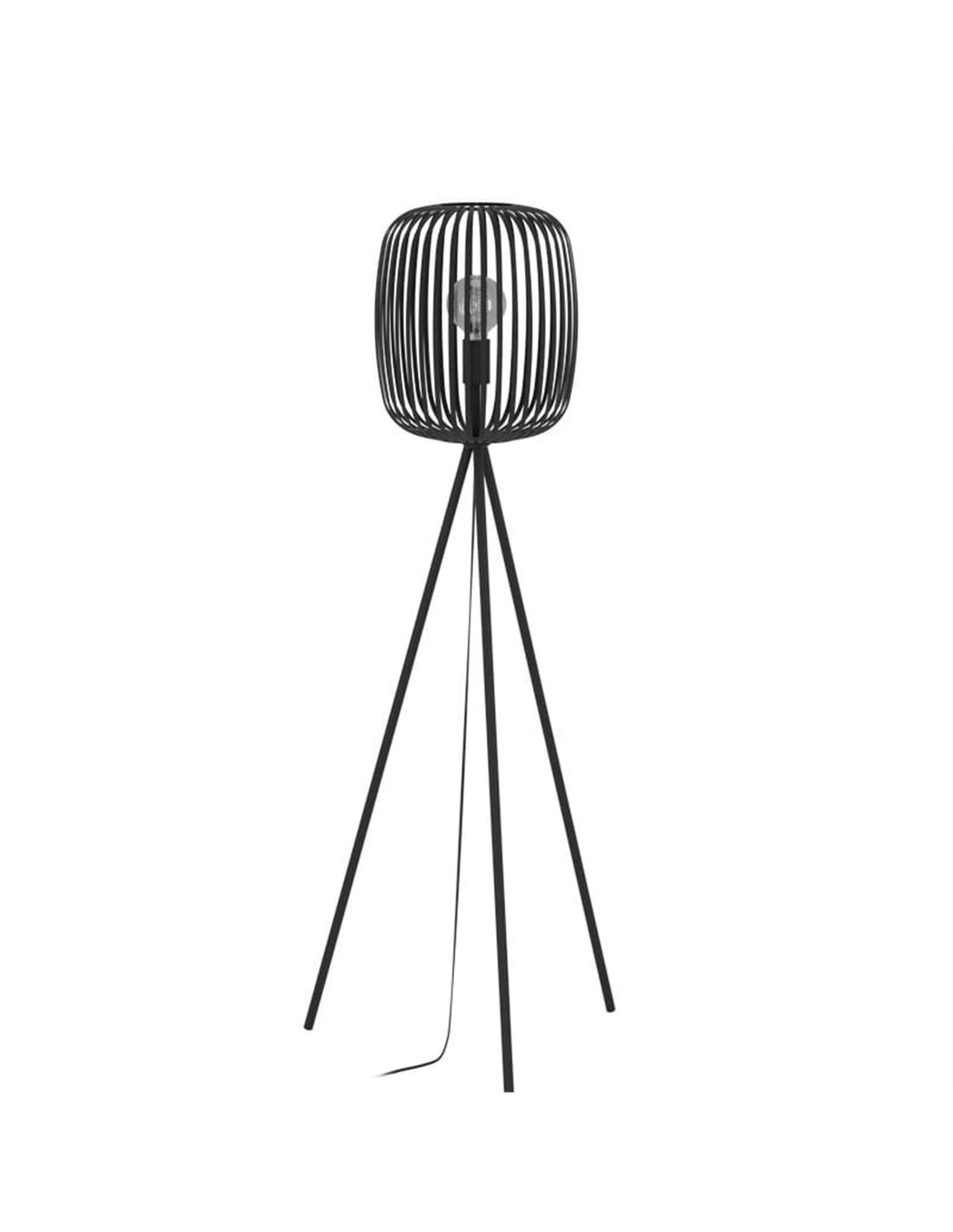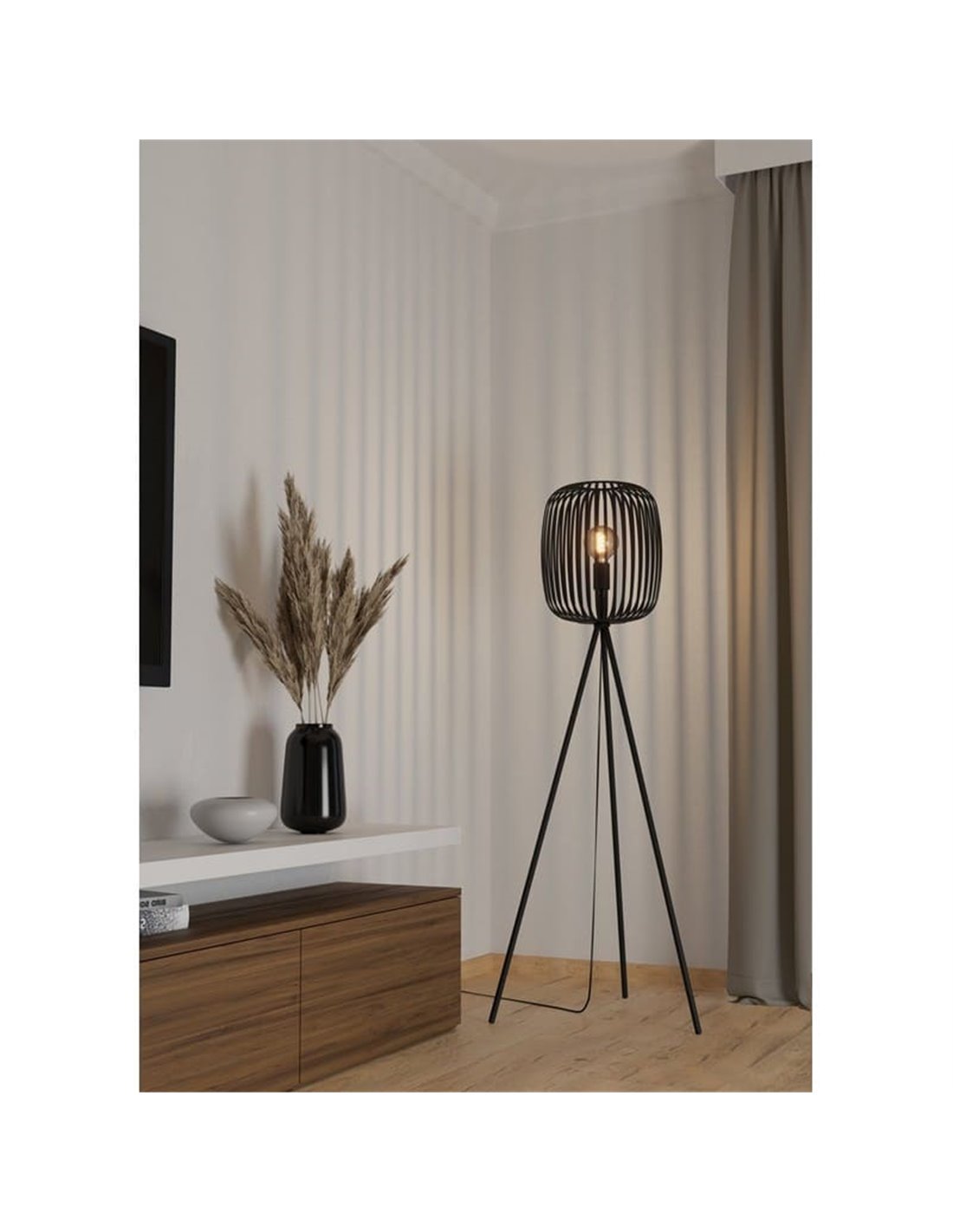 Stehlampe ROMAZZINA von EGLO mit 3 Beinen in schwarzem Metallfinish, mit E27 für den Innenbereich. Abmessungen: ↕ 1405 mm | Ø 325 mm ca..