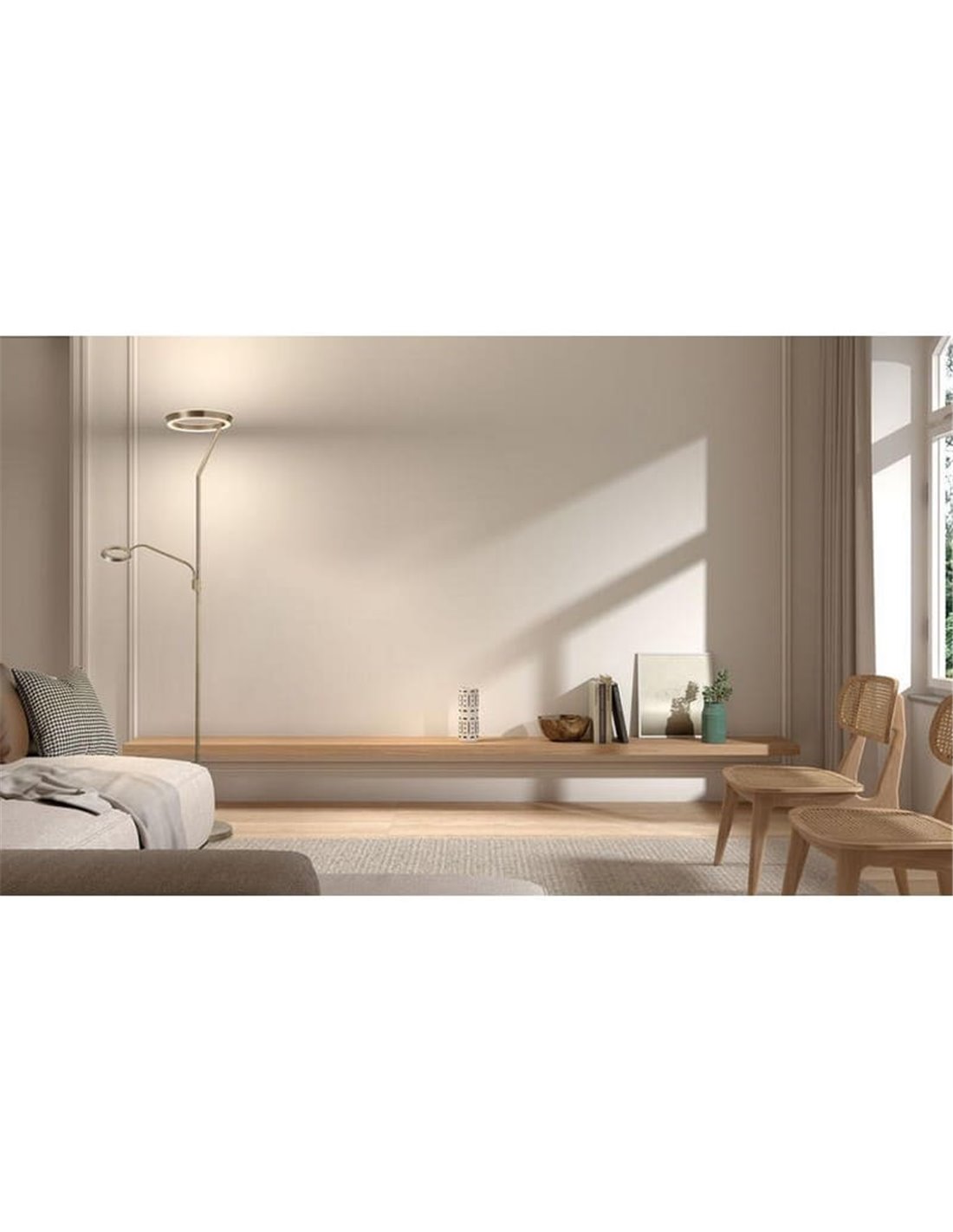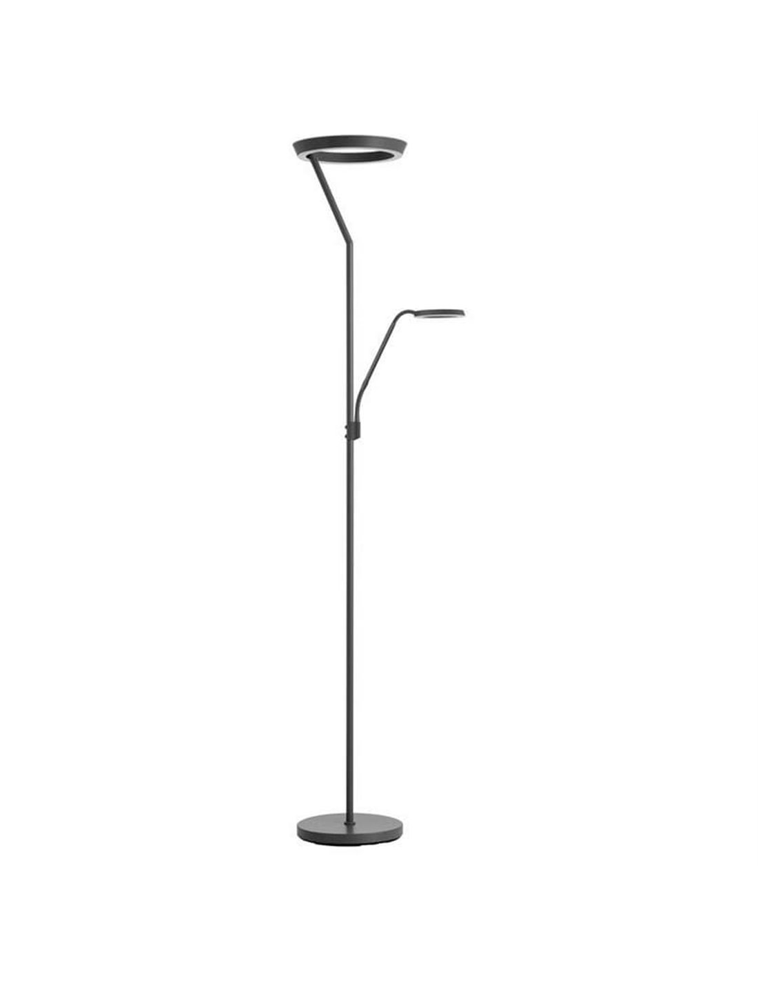 Die Stehlampe mit Leselicht SATURN schwarz von MDC ist eine ideale Lösung, um das Wohnzimmer oder Schlafzimmer mit einer Kombination aus Umgebungslicht und punktueller Beleuchtung in einem einzigen Stück zu erhellen. Der obere Fokus von 40W und 4800Lm bietet eine starke und gleichmäßige allgemeine Beleuchtung, während der Lesearm von 5W und 725Lm einen direkten Lichtpunkt bietet, der perfekt zum Lesen, Arbeiten oder Genießen Ihrer Freizeit mit maximalem visuellen Komfort ist.