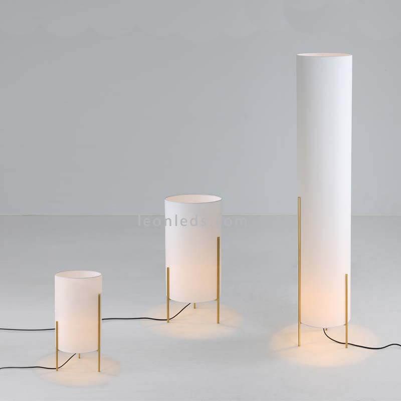 Stehlampe mit Stoffschirm Naos in Weiß und Gold von ACB Iluminación mit minimalistischem Design. Sie besteht aus einem zylindrischen Stoffkörper und einem Standfuß in Form von dünnen goldenen Stäben.