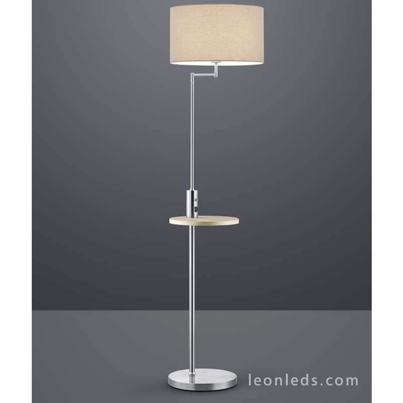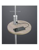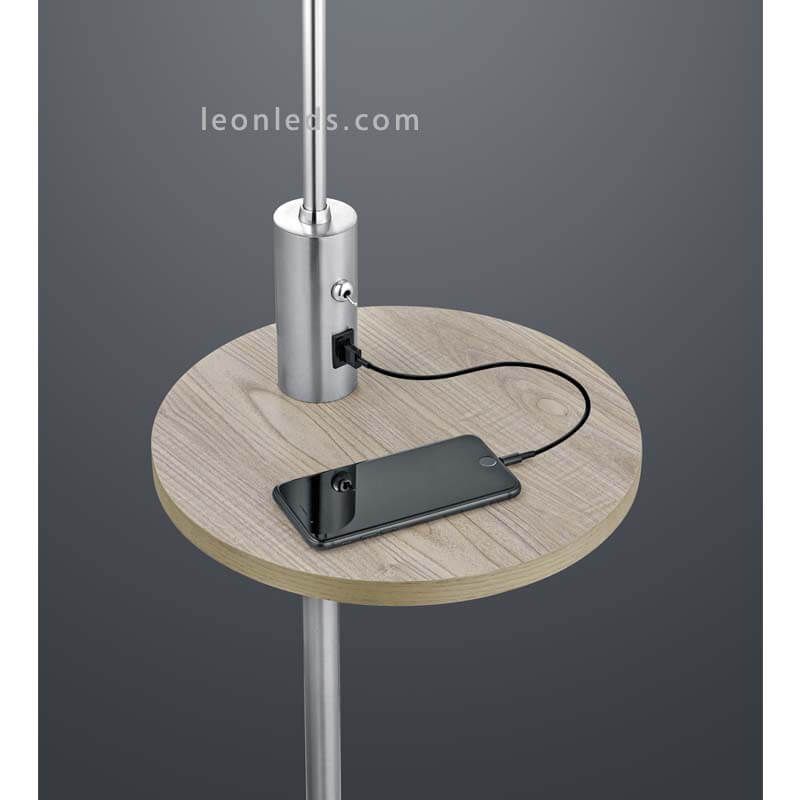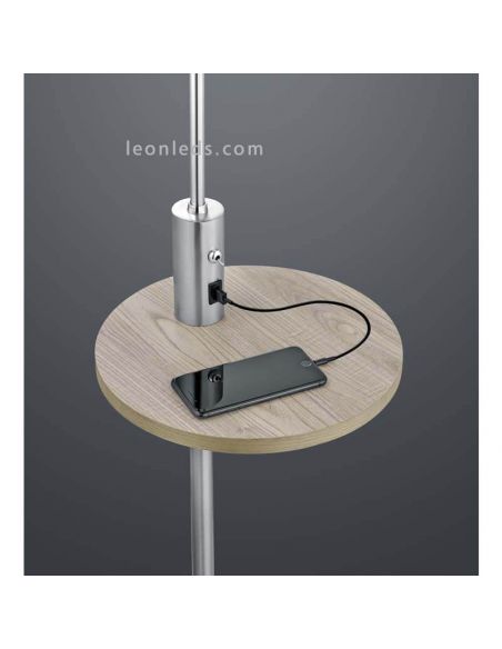 Stehlampe mit USB aus der Claas Trio Lighting Kollektion mit einer Holzablage, auf der wir das Handy aufladen können und wo sich der Ein-/Ausschalter befindet. Diese stehlampe mit USB moderne Lampe besteht aus einer Metallstruktur in Nickel und einer runden textilen Schirm in grauer Farbe. Diese Stehlampe mit USB bietet eine Höhe von 160Cm, eine Breite von 40Cm und eine Länge von 40Cm. Sie enthält 1,8 Meter Kabel, du kannst alle Maße auf einem der Fotos sehen.