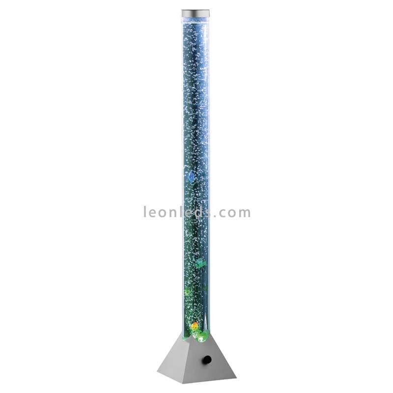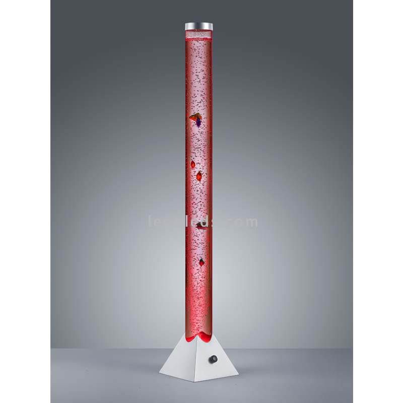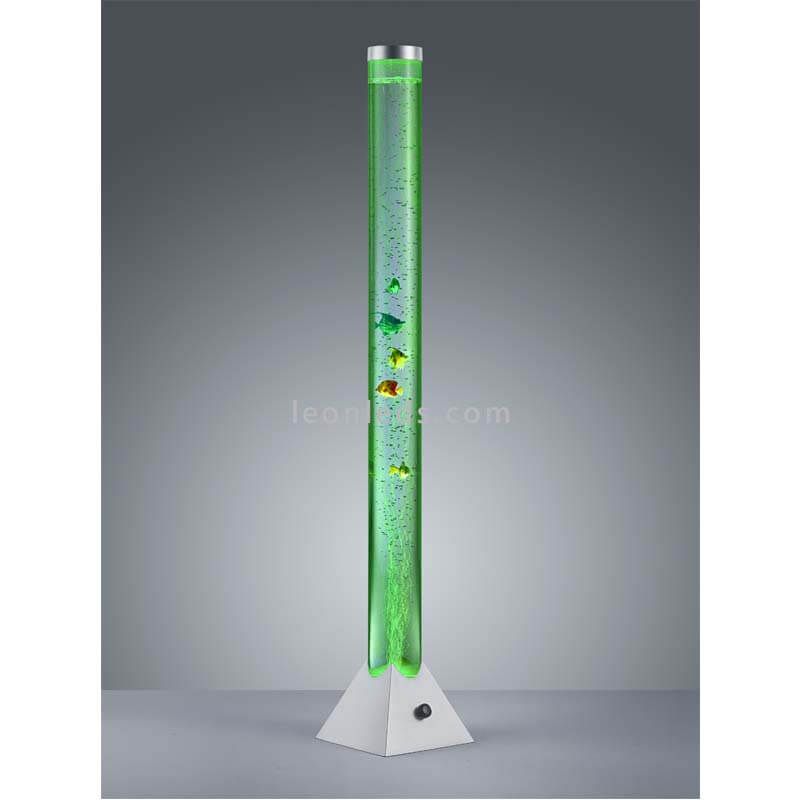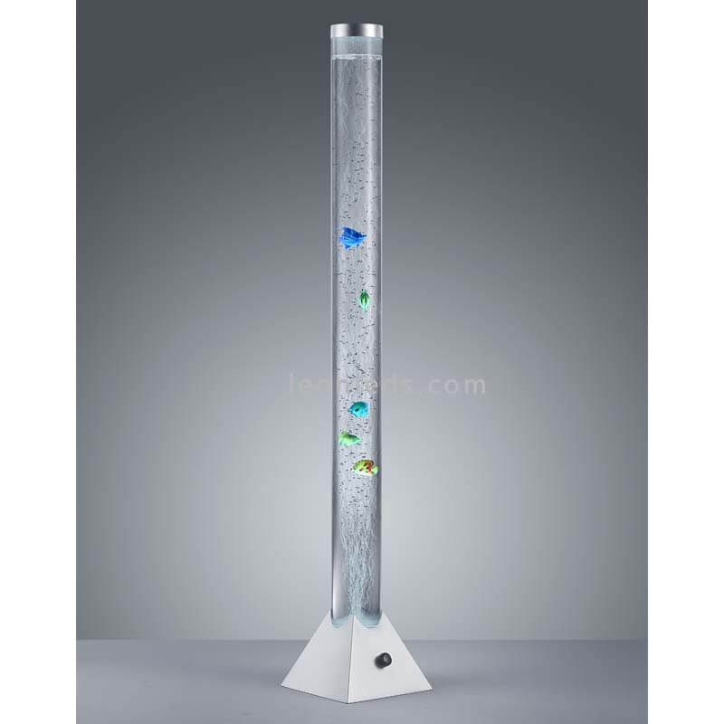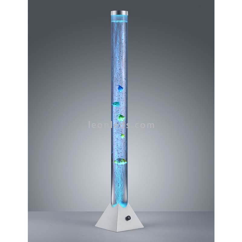 Multicolor LED-Stehlampe in Form eines Aquariums mit Kunststofffischen aus der neuen Kollektion der intelligenten Lampen MOTION von Trio Lighting. Es handelt sich um eine LED-Fußlampe mit einem integrierten Fußschalter im Kabel zur Bedienung. Sie ist eine Lampe mit verschiedenen Farben wie Rot, Grün und Blau. Ihre Außenfarbe ist Chrom und ihr Finish aus Kunststoff.