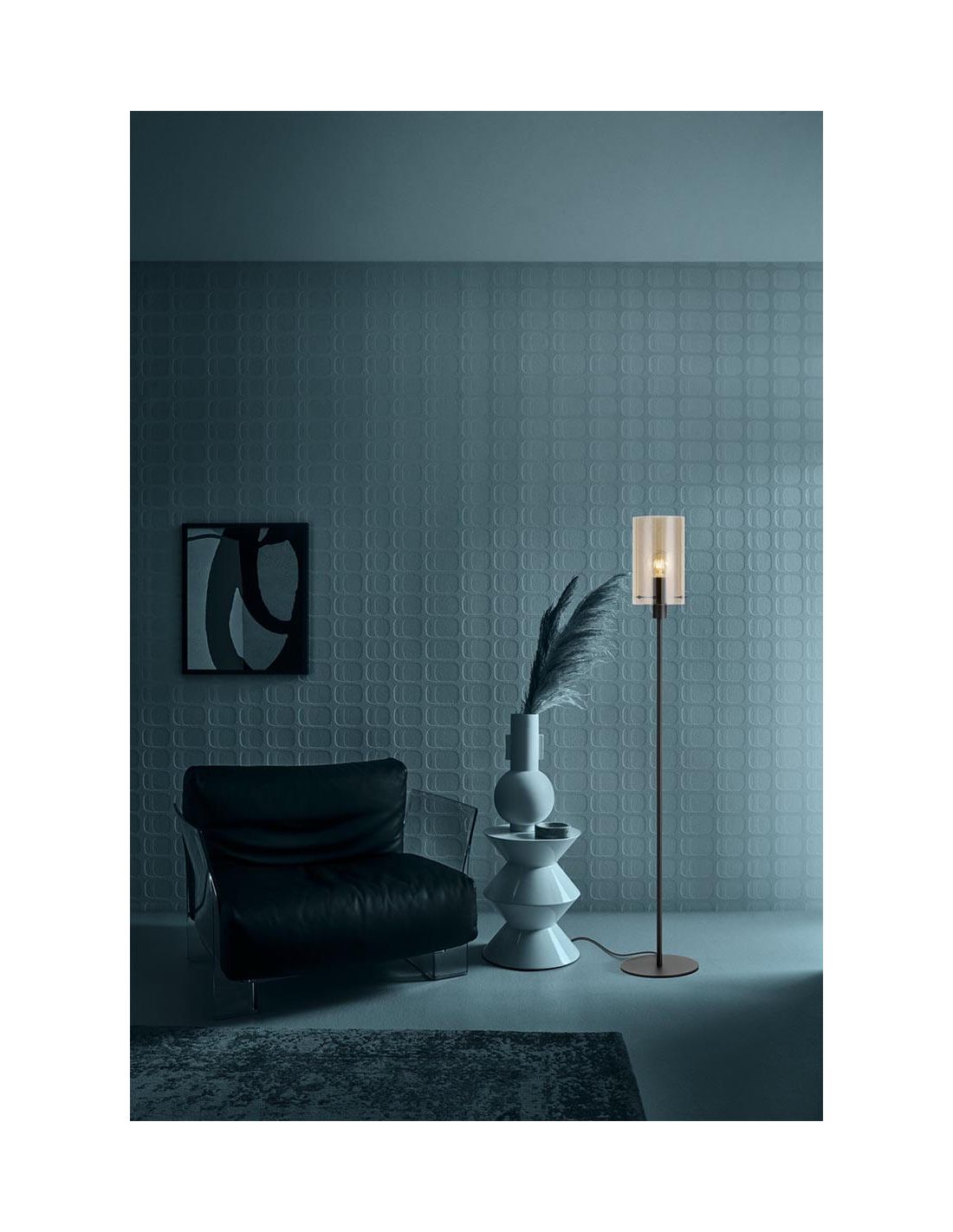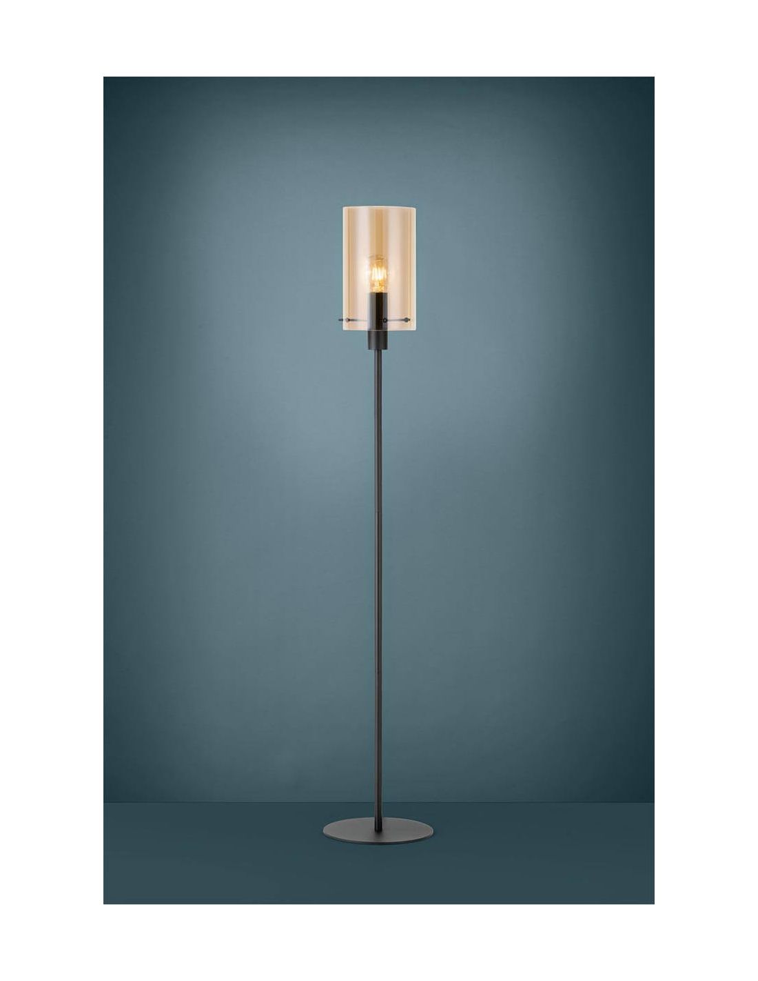 Der zylindrische Schirm aus bernsteinfarbenem, poliertem Glas erzeugt einen sanften und warmen Lichteffekt, perfekt für eine gemütliche Atmosphäre im Wohnzimmer, Schlafzimmer oder Esszimmer. Der schwarze Stahlfuß verleiht einen zeitgemäßen Touch, wodurch diese Stehlampe zur idealen Wahl für moderne und designorientierte Innenräume wird.