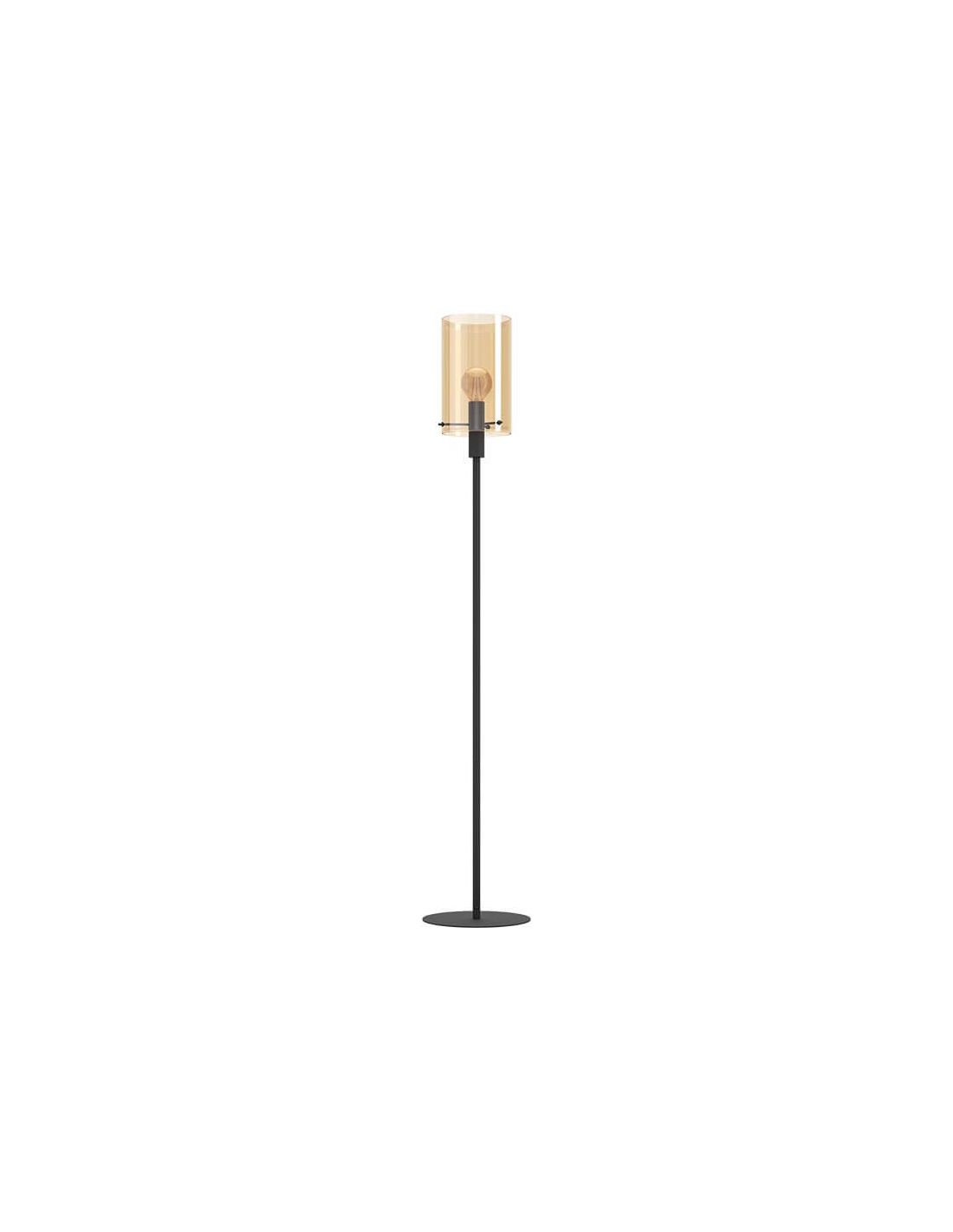 Die Stehlampe POLVERARA kombiniert einen eleganten Schirm aus bernsteinfarbenem, poliertem Glas mit einem schwarzen Stahlfuß. Ideal für moderne Innenräume, ist sie kompatibel mit E27-Glühbirnen und hat einen Fußschalter am schwarzen Textilkabel.