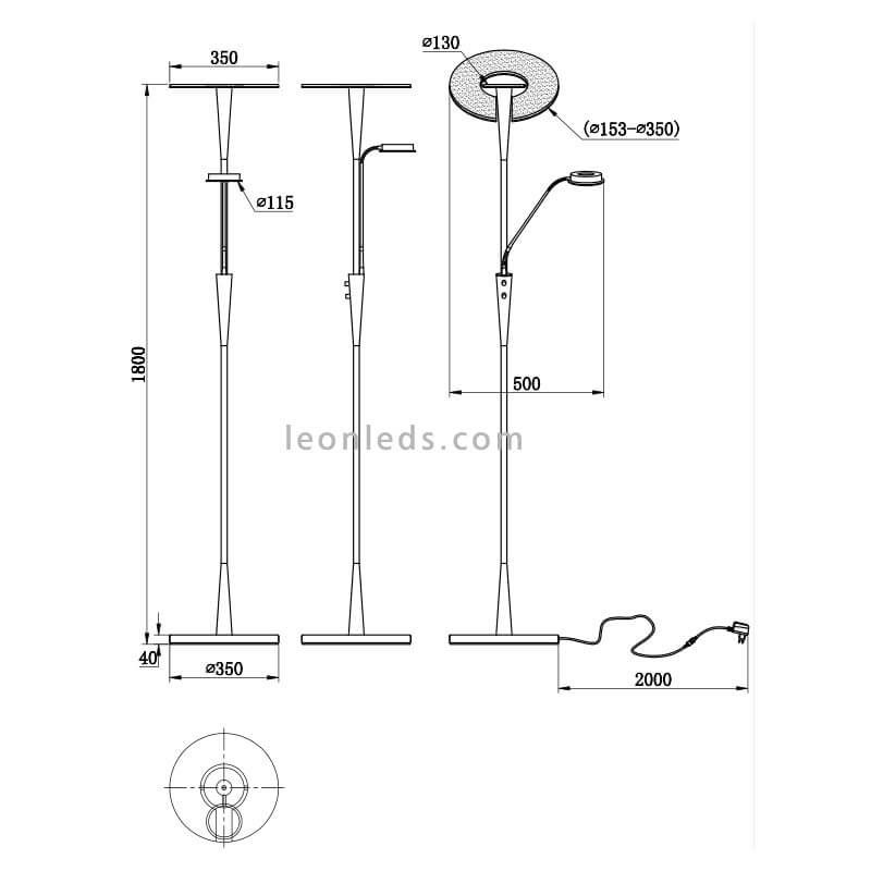 Stehlampe LED Quebec in Mattnickel mit einer Leistung von 34W im Hauptlicht und 5,5W im Lesearm, eine Lichtintensität von 3000Lm und 400Lm, bei beiden kann die Lichtintensität und die Farbtonregelung (von 3000K bis 6000K) geregelt werden. Das Hauptlicht kann gedreht werden, um indirektes Licht nach oben und direktes Licht nach unten oder zur Seite zu erzeugen.