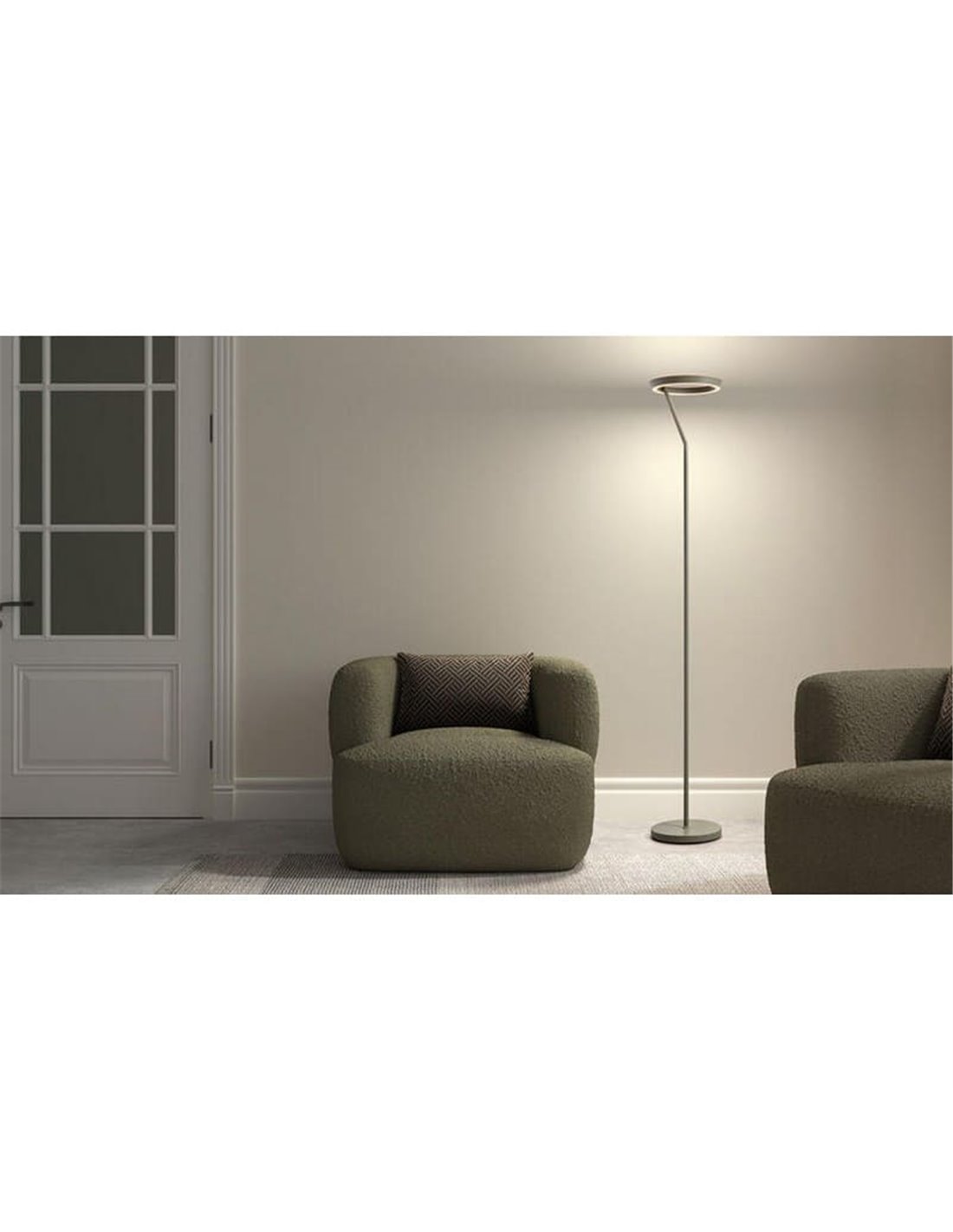 Die Stehlampe SATURN S medaille von MDC ist für diejenigen konzipiert, die eine sorgfältige Ambientebeleuchtung und ein dekoratives Stück mit Präsenz suchen. Ihre schlanke Struktur endet in einem kreisförmigen Lichtkranz von 40W, der 4800Lm bietet und den Strahl sowohl nach oben als auch nach unten lenkt, sodass die Wände mit einem sanften indirekten Licht erhellt werden, das eine sehr angenehme Atmosphäre im Wohnzimmer schafft.