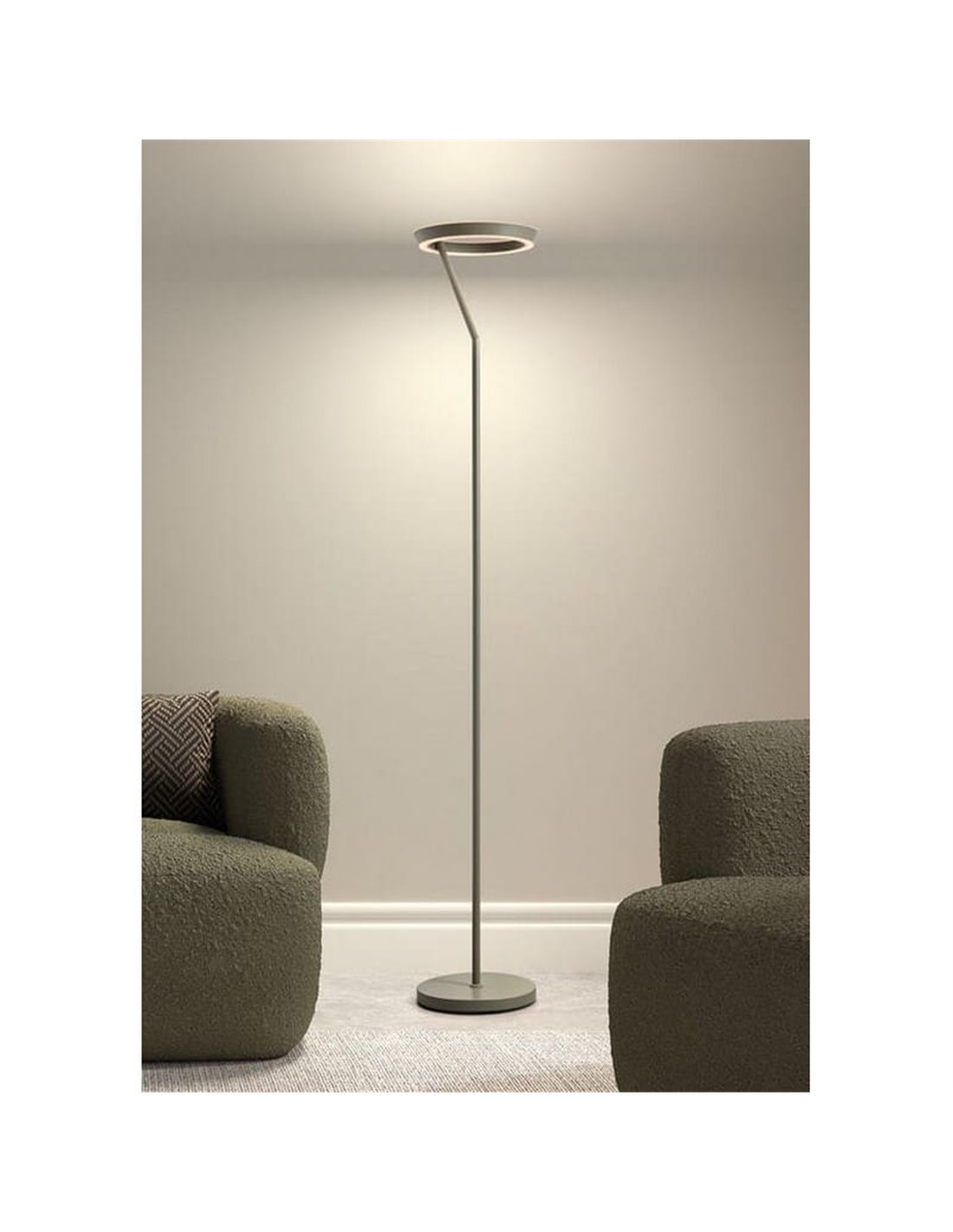 Die Stehlampe SATURN S schwarz von MDC kombiniert ein schlichtes Design mit sehr angenehmer Beleuchtung. Ihre schlanke Struktur in schwarzer Ausführung endet mit einem kreisförmigen Lichtkranz von 40W, der 4800Lm bietet und den Lichtstrahl sowohl nach oben als auch nach unten lenkt. So entsteht ein indirektes Licht, das den Raum umhüllt, ohne zu blenden, ideal, um den Aufenthaltsbereich im Wohnzimmer zu begleiten.