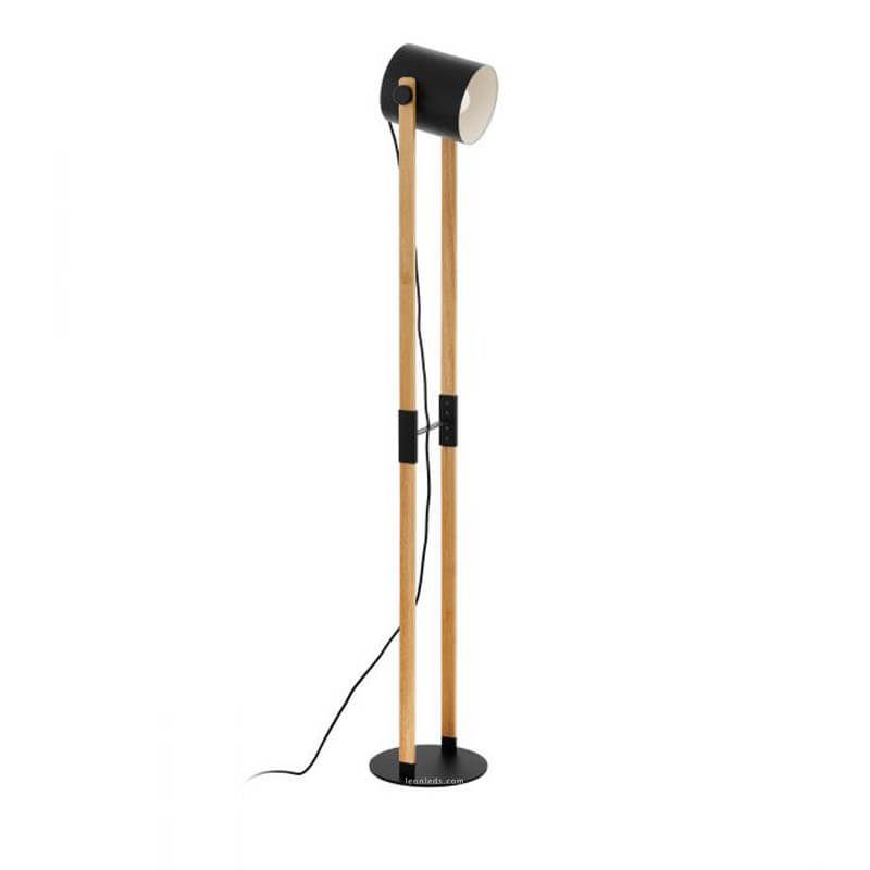 Stehlampe im Vintage-Stil aus der Hornwood-Kollektion von Eglo Iluminación. Sie besteht aus einem drehbaren Stahlreflektor mit mattschwarzer Oberfläche, der an zwei Holzbeinen und einem runden metallischen Sockel in Schwarz befestigt ist. Sie benötigt 1 E27-Glühbirne (nicht enthalten), empfohlen wird eine Leistung von 7 bis 13W in warmem Licht.