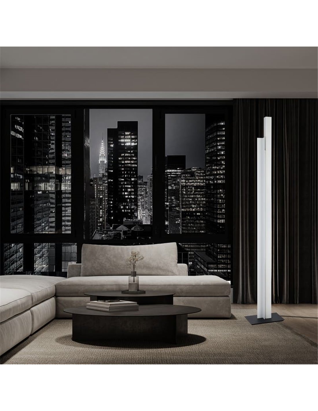 Die Stehlampe LED MANHATTAN in weiß bietet 48W, 4200 lm und Licht 3000K mit inkludiertem Dimmer (Helligkeitsregelung). Minimalistisches Design aus Aluminium/Metall/Acryl, ideal für Wohnzimmer, Büro oder Arbeitszimmer. Höhe 200 cm, schwarzes Kabel 1,8 m. IP20. Lebensdauer LED 30.000 h. Abmessungen: ↕ 200 cm | 35 × 25 cm.
