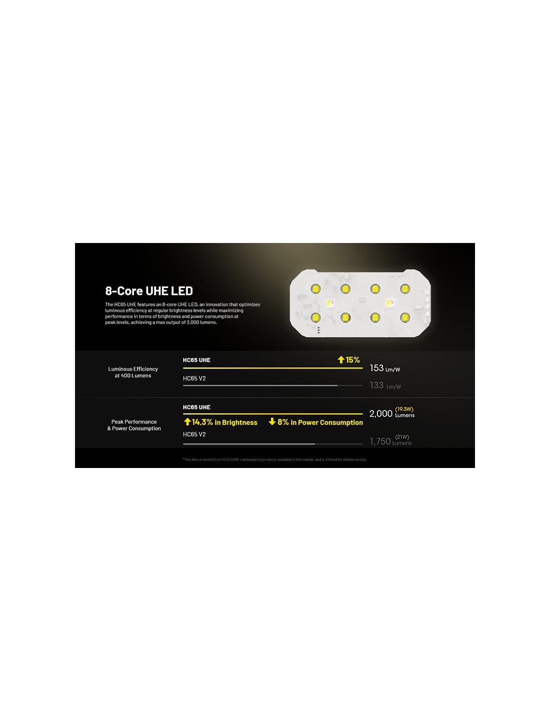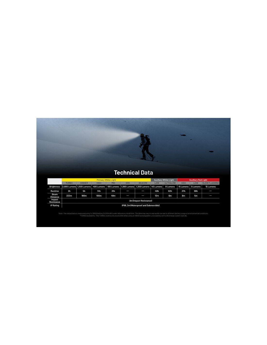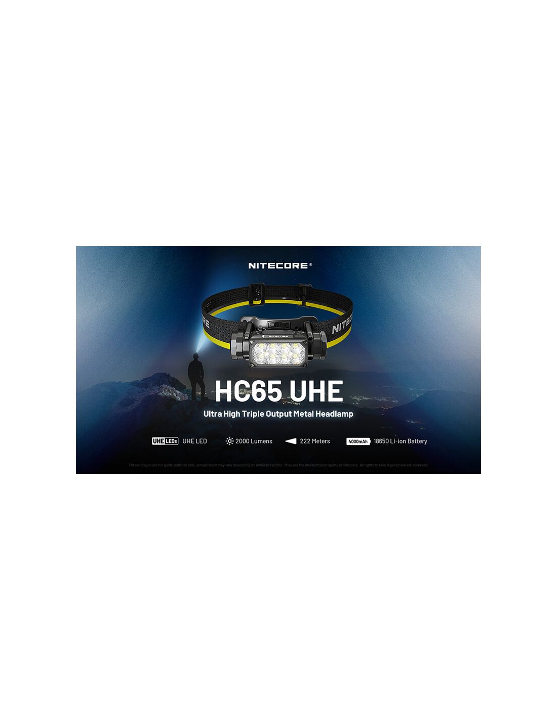 LED-Stirnlampe HC65 UHE mit einer maximalen Leistung von 2.000Lm, einer maximalen Reichweite von 222 Metern und einer maximalen Laufzeit von 31 Stunden, stoßfest bis zu 2 Meter und mit einem Schutzgrad von IP68 gegen Wasser und Staub, tauchbar bis zu 2 Meter unter Wasser.