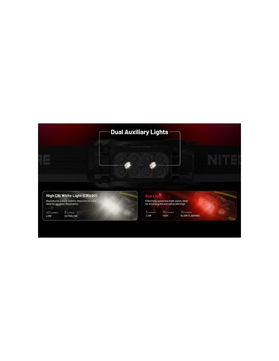 Bietet 4 verschiedene Leistungsstufen, 3 Modi mit rotem Licht und einen Modus im hochauflösenden Licht CRI90 + 2 spezielle Modi (Beacon und SOS).