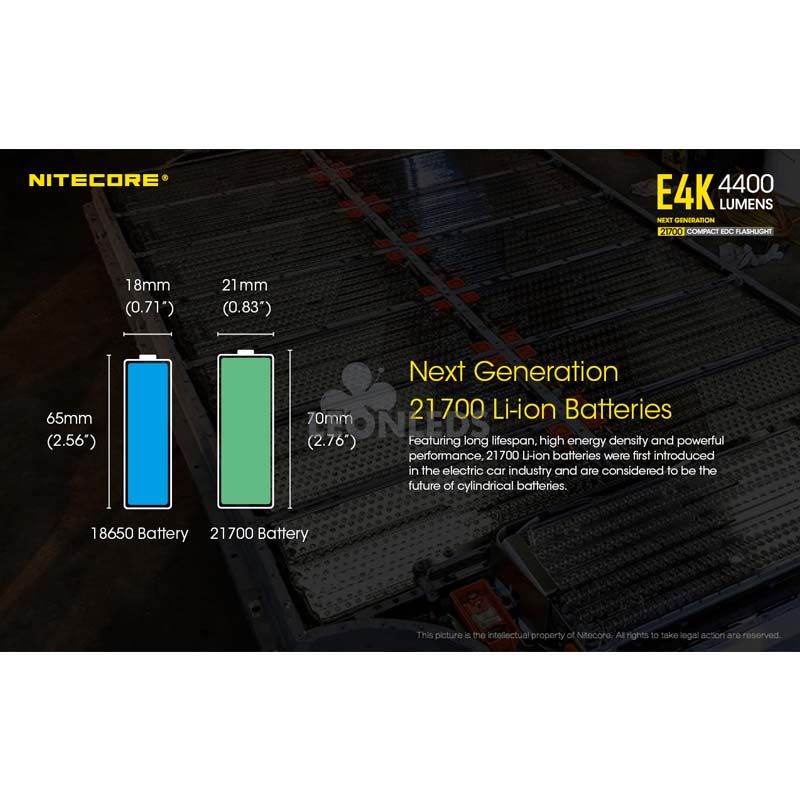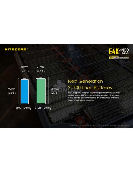 Nitecore E4K enthält einen 5.000 mAh NL2150HPR-Akku und ist kompatibel mit CR123- / RCR123-Batterien, zudem verfügt sie über einen Batterie-Level-Indikator.