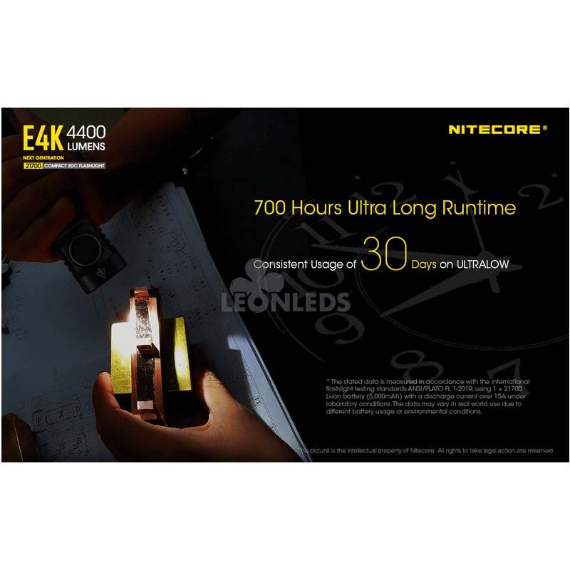 Nitecore E4K hat eine Lebensdauer von 50.000 Stunden und eine Laufzeit von 700 Stunden bei kontinuierlicher Nutzung über 30 Tage im ULTRALOW-Modus.