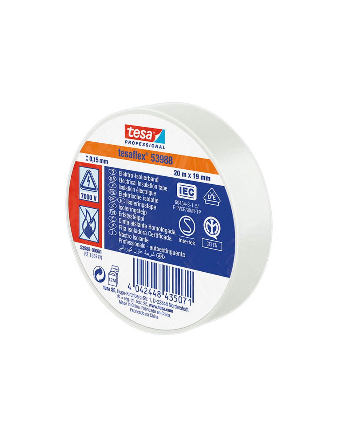 Tesa Professional 53988 Isolierband weiß von 19mm x 20m, homologiert nach IEC 60454-3-1, mit Durchschlagspannung von 7000V, einer Dicke von 150 μm und stark haftendem Kleber. Perfekt für die Isolierung und Kennzeichnung von Kabeln.