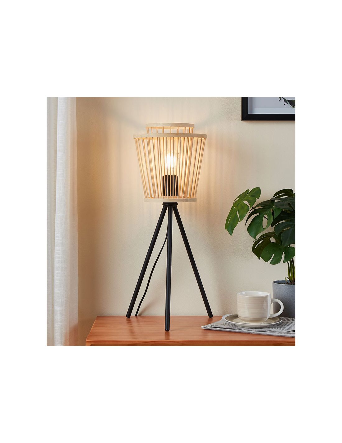 Fügen Sie Ihrem Raum mit der Tischlampe aus Holz HYKEHAM einen Hauch von Stil und Raffinesse hinzu. Mit schwarzen Stahlfüßen und einem Durchmesser von 38cm bietet diese Lampe warmes und sanftes Licht, das perfekt ist, um eine einladende Atmosphäre in jedem Raum zu schaffen.