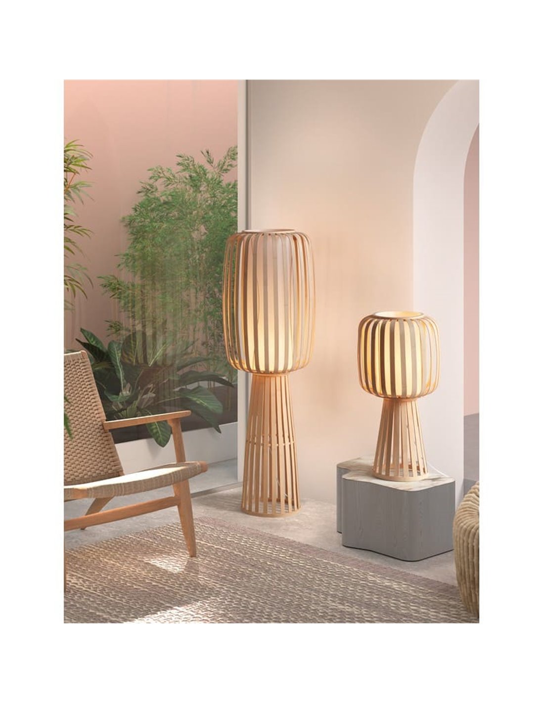 Die Tischlampe CINTIA von MDC ist ein einzigartiges dekoratives Element, das Wärme und natürlichen Stil in jeden Raum bringt. Ihre Struktur aus handgewebtem Natur-Bambus erzeugt ein charmantes Spiel von Licht und Schatten, während der weiße Innenschirm die Beleuchtung sanft verbreitet.