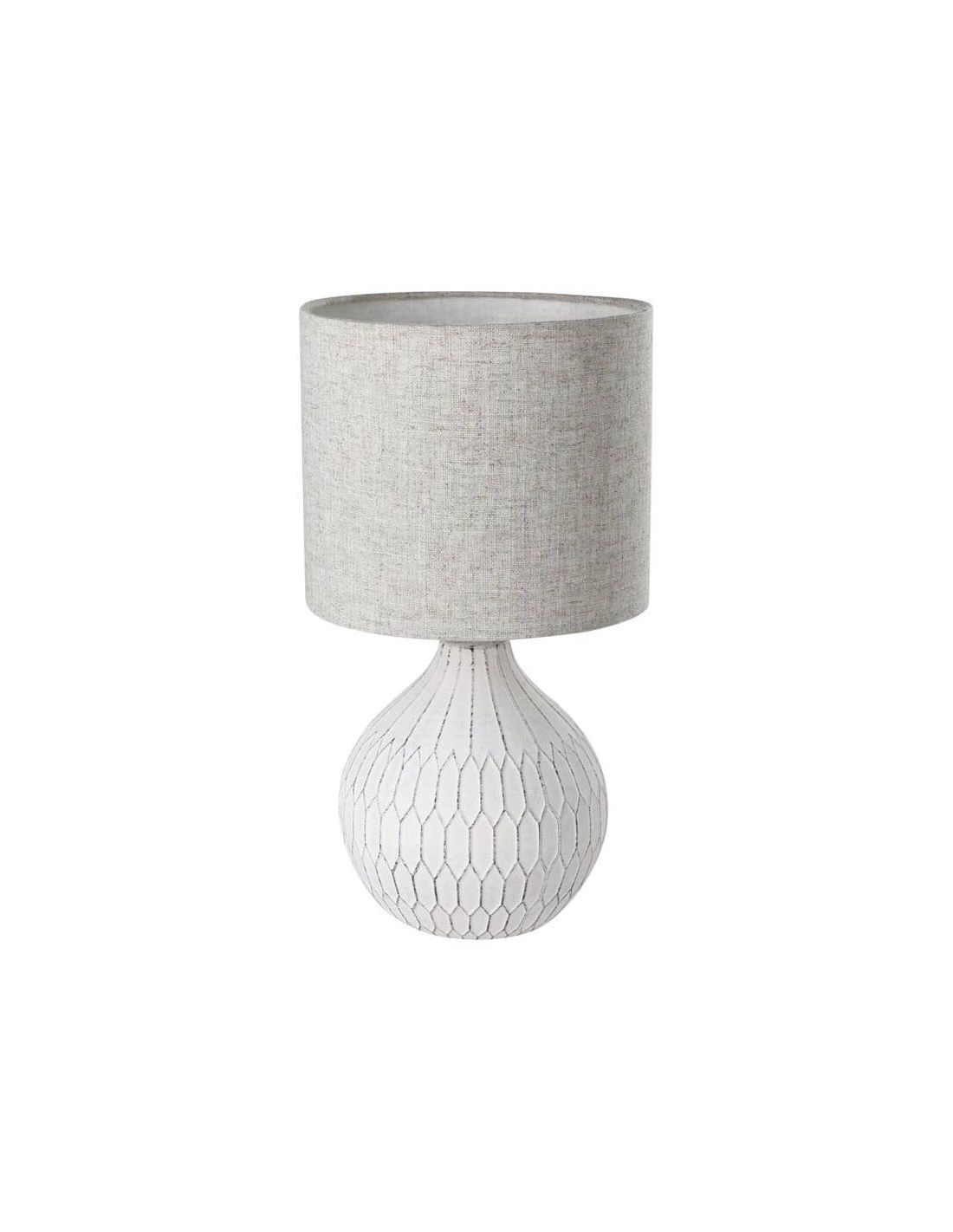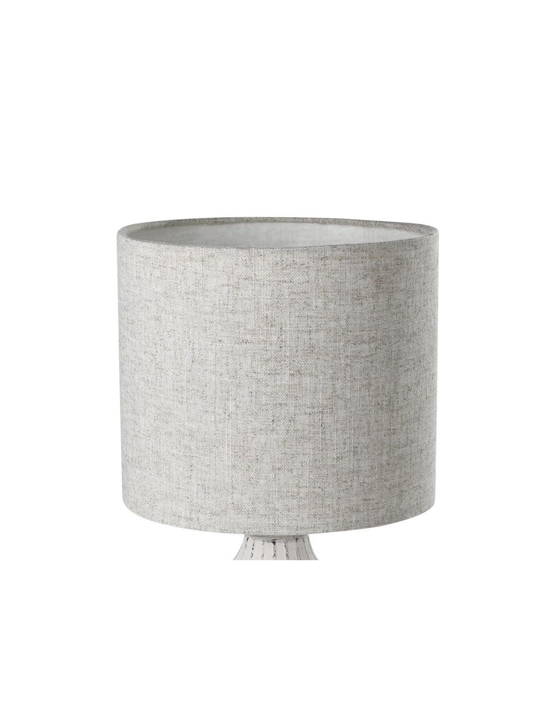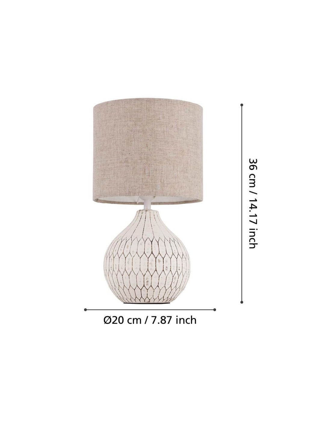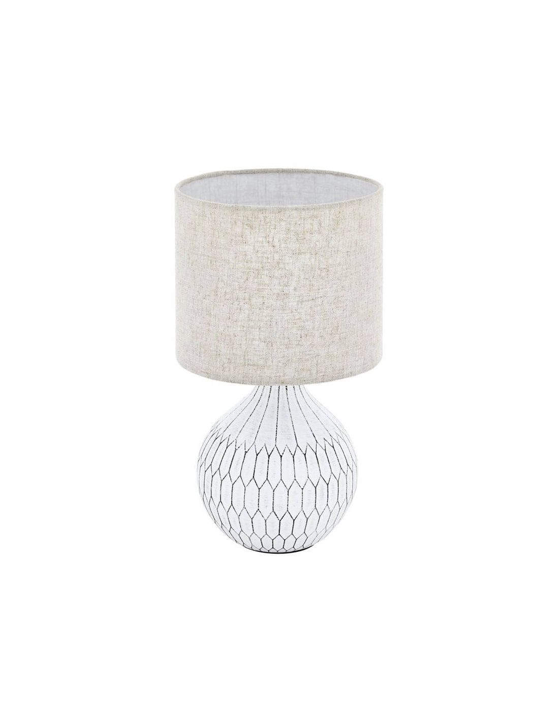 Tischlampe BELLARIVA 3 mit Keramikbasis im Boho-Stil und Schirm aus hellbraunem Textil. Ideal für Nachttische, Wohnzimmer und Esszimmer. Kompatibel mit E27-Glühbirnen.