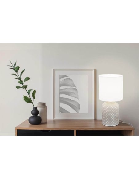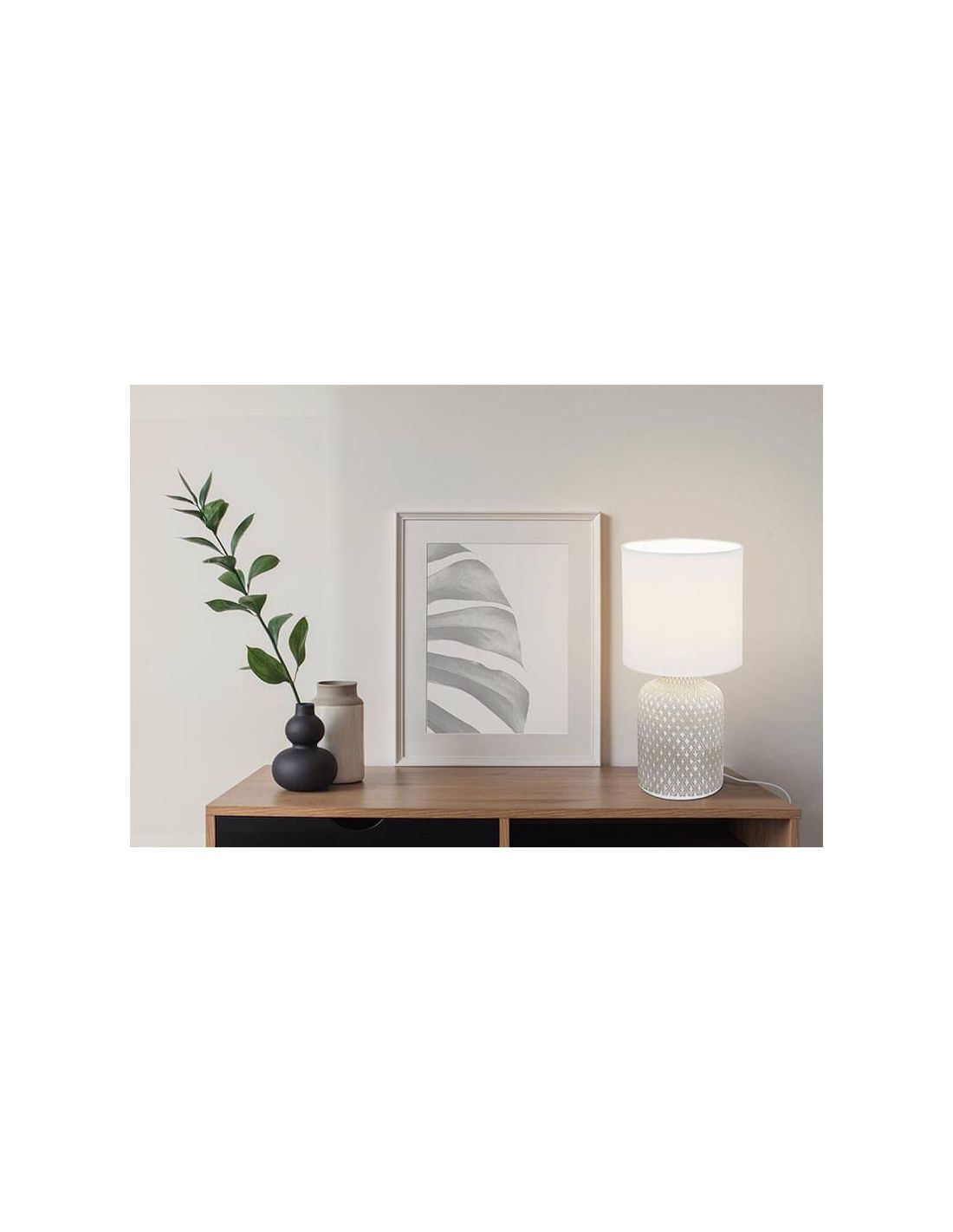 Die Tischlampe BELLARIVA besticht durch ihr charmantes Boho-Design und Funktionalität. Mit einer grauen Keramikbasis in einem modernen, abgerundeten Muster und einem runden, weißen Stoffschirm wird diese Lampe zu einem attraktiven Deko-Element für Liebhaber von Details und Strukturen.