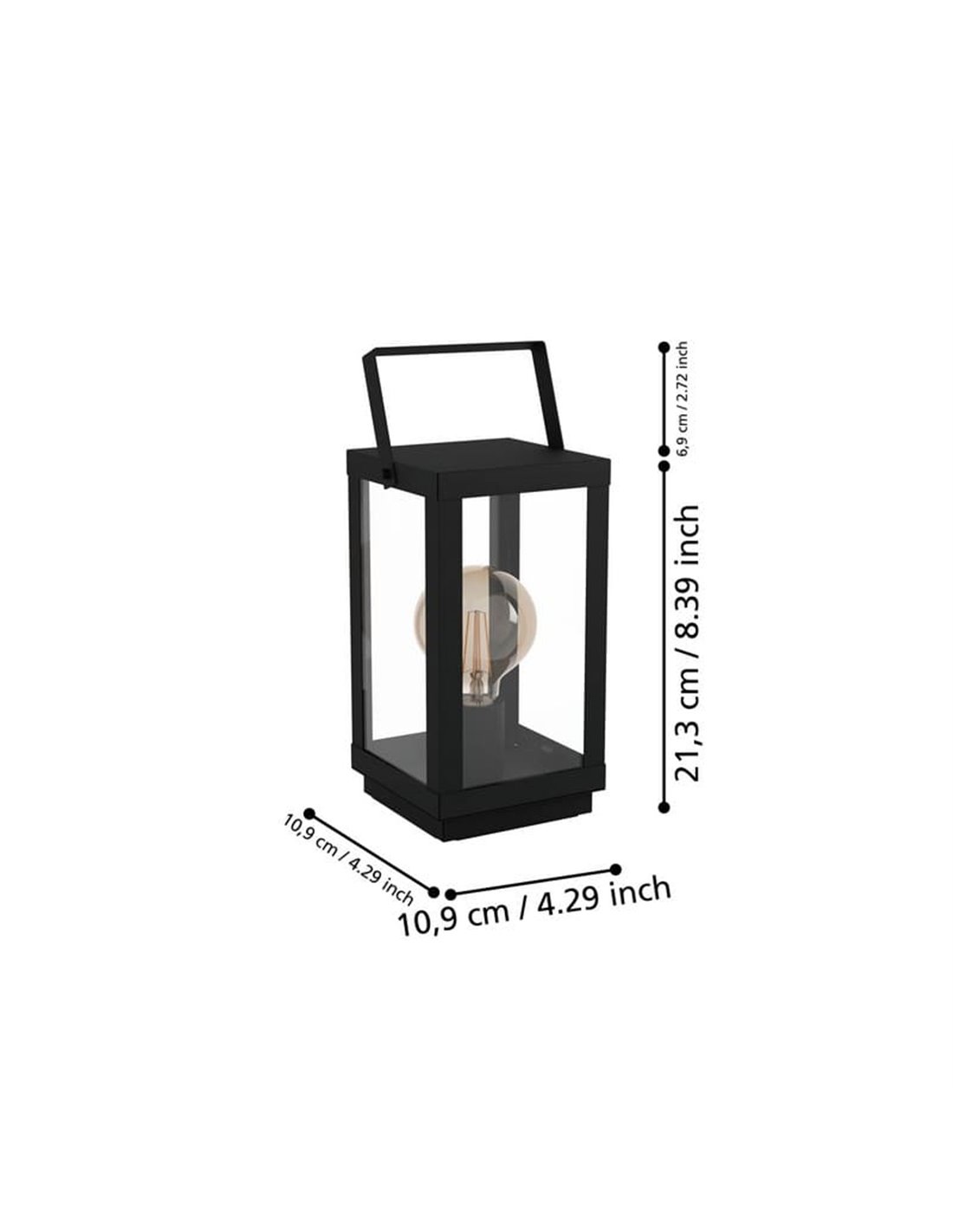 Tischlampe BRADFORD 1 von Eglo, mit klassischem Laternen-Design aus schwarzem Metall und transparentem Glas. Kompatibel mit E27-Glühbirnen (nicht enthalten). Perfekt für die Beleuchtung jeder Einrichtung mit einem Vintage-Touch.