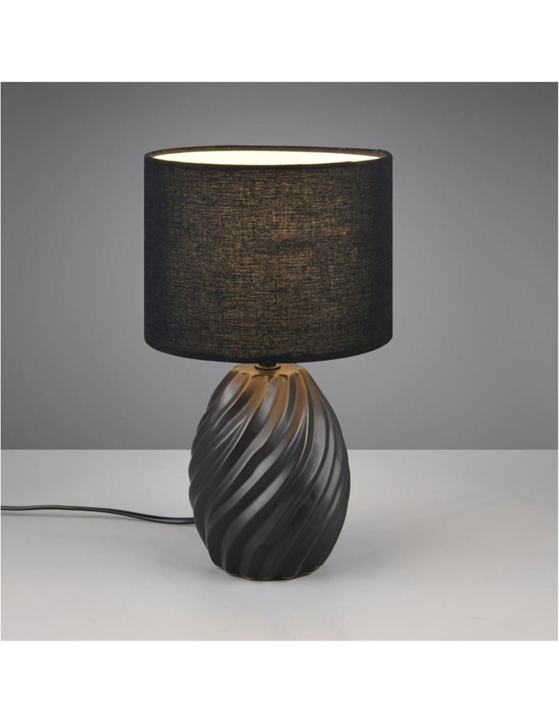 Die Tischlampe MELVA kombiniert zeitgenössische Eleganz mit einem zeitlosen Design, perfekt zur Schaffung von Wärme und Raffinesse in jedem Raum. Ihre Basis aus mattschwarzer Keramik hat eine gewellte Form mit spiralförmiger Textur, die visuelle Dynamik schafft und das Licht subtil reflektiert, während der Schirm aus schwarzem Stoff das Licht weich filtert und eine warme und einladende Atmosphäre schafft.