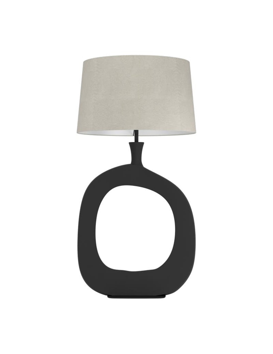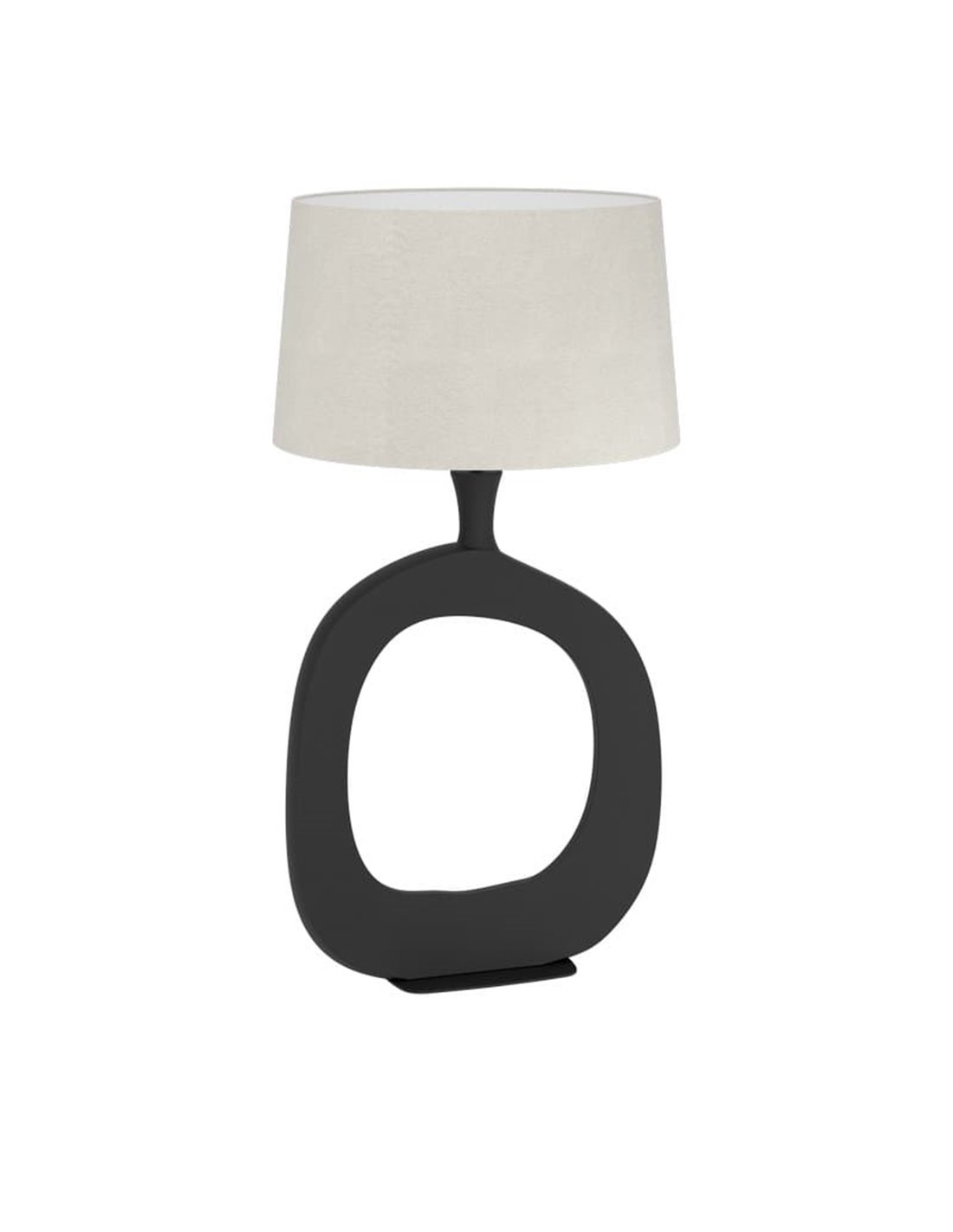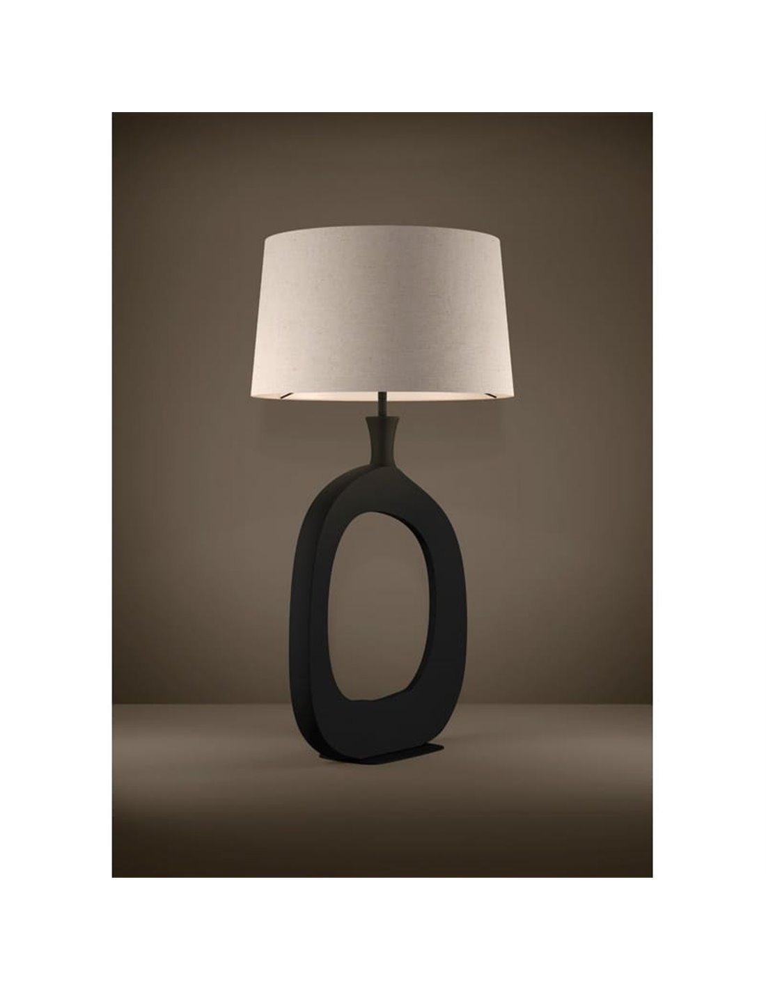 Die stilisierte Version von DIEZMA setzt auf eine höhere und schlankere Struktur, wodurch sie zu einer dekorativen Lampe mit größerer visueller Präsenz wird. Ihr skulpturaler Sockel in schwarzem Finish und der Schirm aus naturbelassenem Leinen schaffen ein elegantes Stück, das sowohl eingeschaltet als auch ausgeschaltet auffällt.