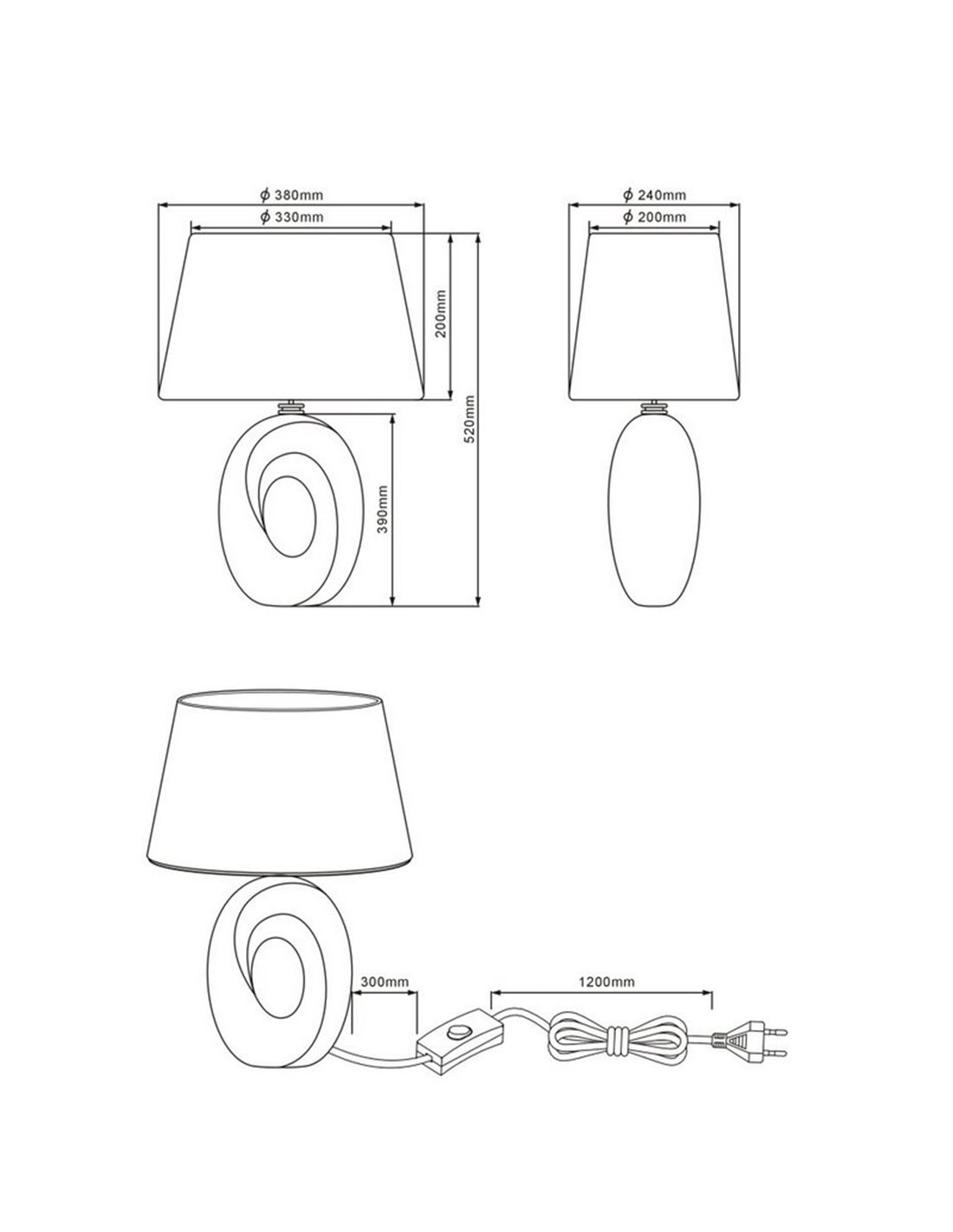 Diese Nachttischlampe bietet ein modernes Design und die Höhe der Lampe beträgt 52Cm, der Schirm hat eine Länge von 38Cm und eine Breite von 24Cm. Ihr Sockel hat eine Höhe von 39Cm.