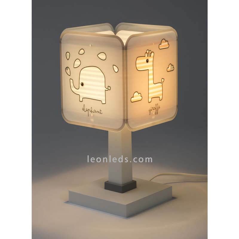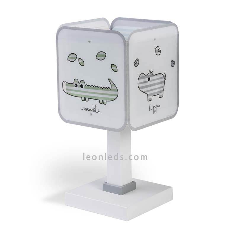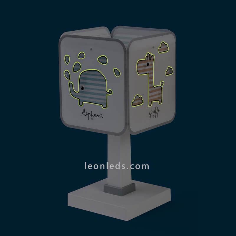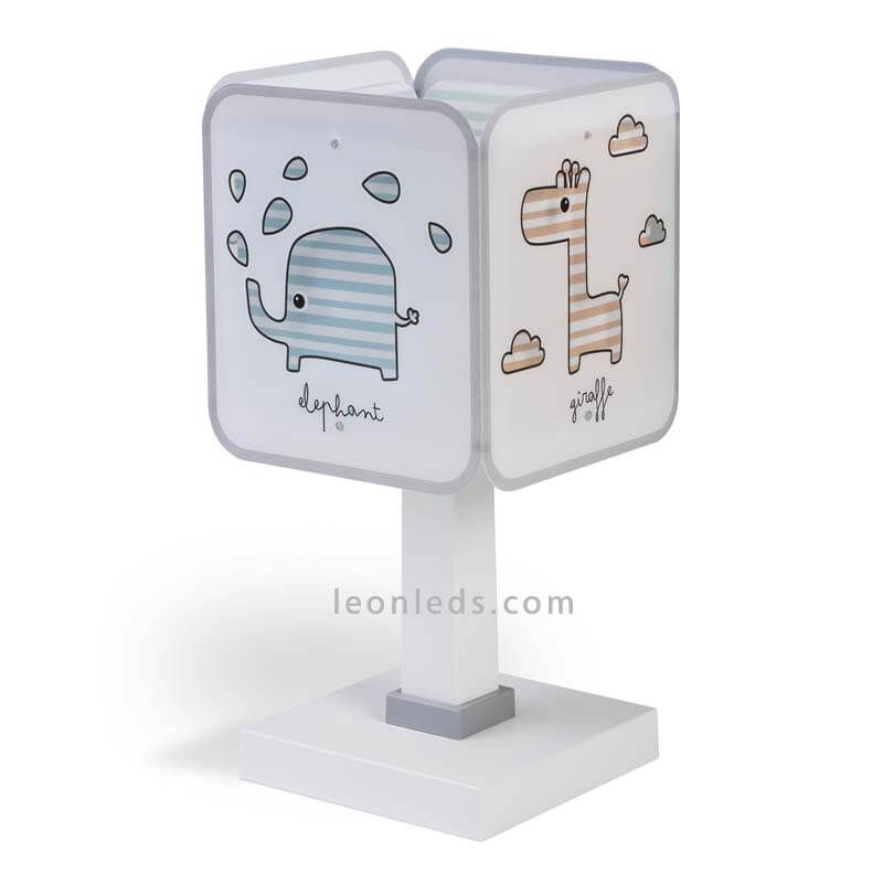 Tischlampe aus der neuen Serie von Dalber, Baby Zoo, mit einem kinderfreundlichen Design. Die Struktur dieser Lampe ist weiß mit einem grauen Detail, der Schirm ist quadratisch und mit Tieren auf einem weißen Hintergrund mit farbigen Streifen dekoriert. Der Rand der Tiere leuchtet im Dunkeln.
